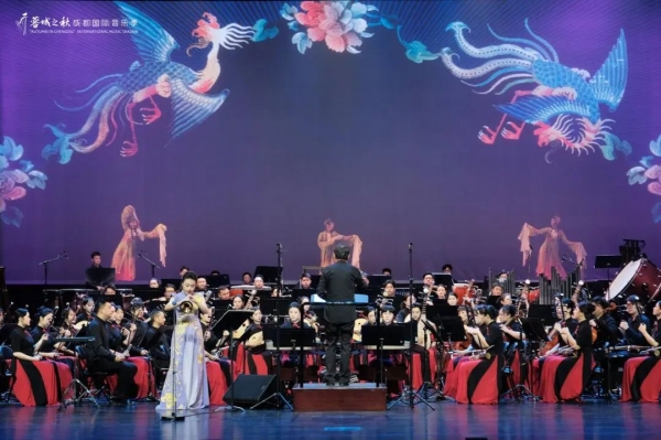 ”的风采。音乐会上,民族乐器用其独特而宽阔的恢弘之声,再次描绘了成都“万户千门入画图”之景象。其中,唢呐演奏家张倩渊带来一曲《腔调》,融合了川剧唱腔、川打锣鼓、水袖等成都文化的经典符号,汇聚成独属于现代蜀人的腔调。音乐会最后,演奏家们用《天府画卷》奏响这令人感叹的繁华盛世,和这历经千年依旧青春飞扬的成都。
