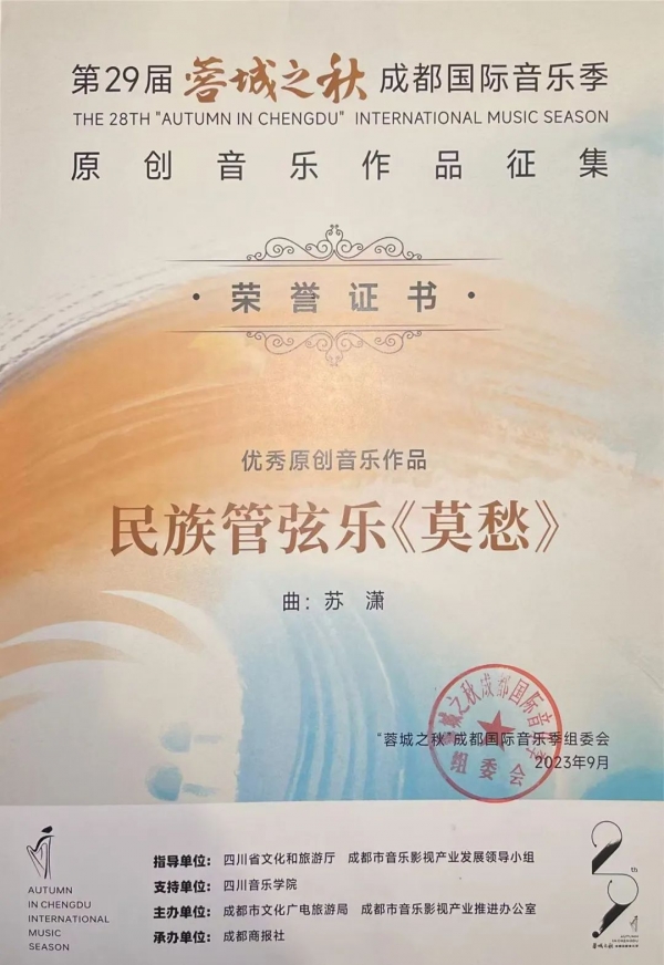 苏潇副教授表示,这场原创音画国乐以成都的古韵为载体,通过民族管弦乐这一传统音乐形式,将成都的历史文化与现代审美相结合,为观众呈现一幅秀美成都和繁荣中国的盛世画卷。这不仅是对成都这座城市历史文化的深情致敬,更是对新中国成立75周年至今繁荣发展热烈庆祝的“振奋之音”。去年,苏潇作品《莫愁》在第29届“蓉城之秋”原创音乐作品征集中被评为“优秀原创音乐作品”。