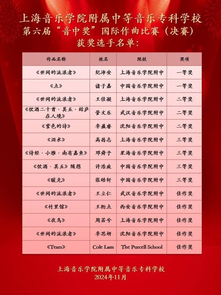 “音中奖”自2013年首届成功举办以来,已成为全国乃至全球一线青少年作曲赛事品牌。本届“音中奖”共收到来自中国、美国、英国、日本、韩国、法国、德国等全球多个国家和地区的共计112 部作品。经过为期数周的选拔与角逐,最终获奖名单如下: