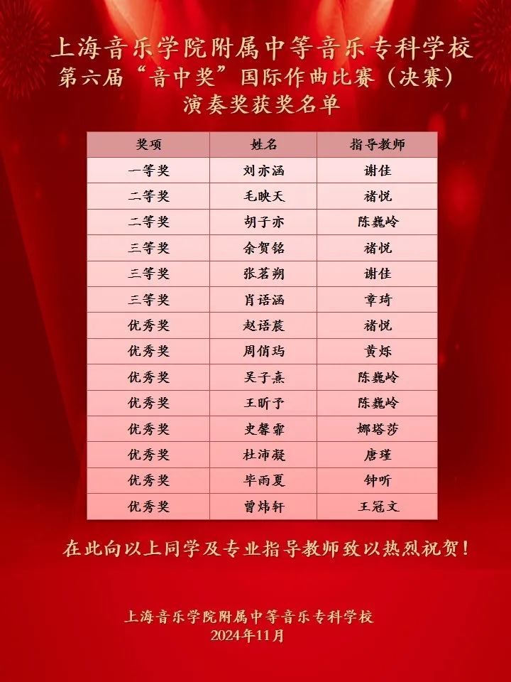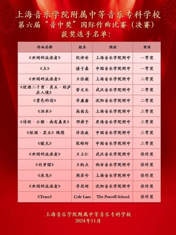 祝贺第六届“音中奖”国际作曲比赛圆满结束!感谢大家给予的关心和支持!十余年来,我们创设和精心打造“音中奖”这一赛事品牌,使它成为国内外知名的青少年音乐创作赛事平台。本届比赛面向全球范围内征集作品,并邀请国内外一线的知名作曲家担任赛事评委。在赛事机制上,我们一贯以现场创作和原创作品结合作为赛制特点,并不断作出尝试与创新,鼓励青少年去实践不同体裁风格的创作。此外,以比赛作为载体,我校还组织了全国青少年音乐创作教学论坛、音乐会、以及作品交流分享会等学术活动,辐射出多层面、多维度对青少年创作的影响力。充分体现了我校对内促进学科融合、推进教学实践,对外融合创新、共享共赢的理念。最后,我们力求以“音中奖”为起点,与兄弟院校们携手一道,推动青少年作曲更上一层楼。期待下一届“音中奖”的相遇!