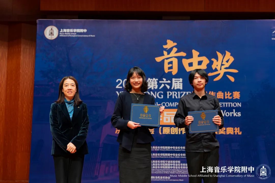 2024年11月11日,第六届“音中奖”国际作曲比赛评委会主席徐孟东教授在颁奖典礼上宣读获奖名单,上海音乐学院附中丁缨校长、周挺副校长分别为获得演奏奖项和获得作品奖项的选手们颁奖。