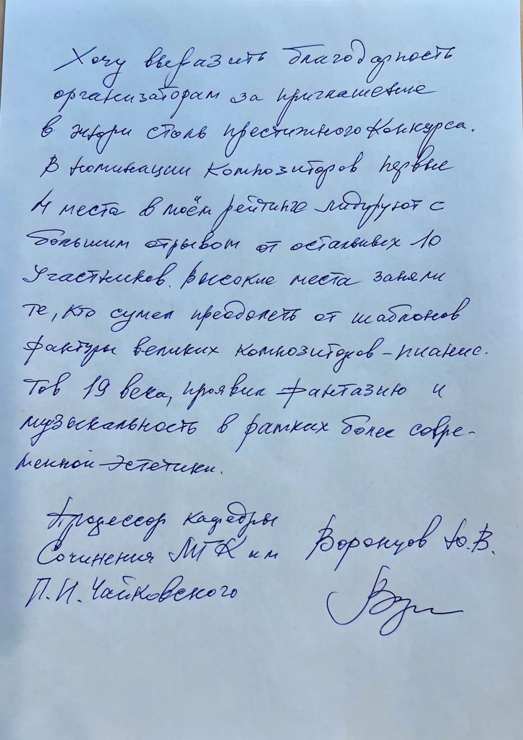 俄罗斯莫斯科柴可夫斯基音乐学院作曲教授尤里·瓦西里耶维奇·沃伦佐夫寄语