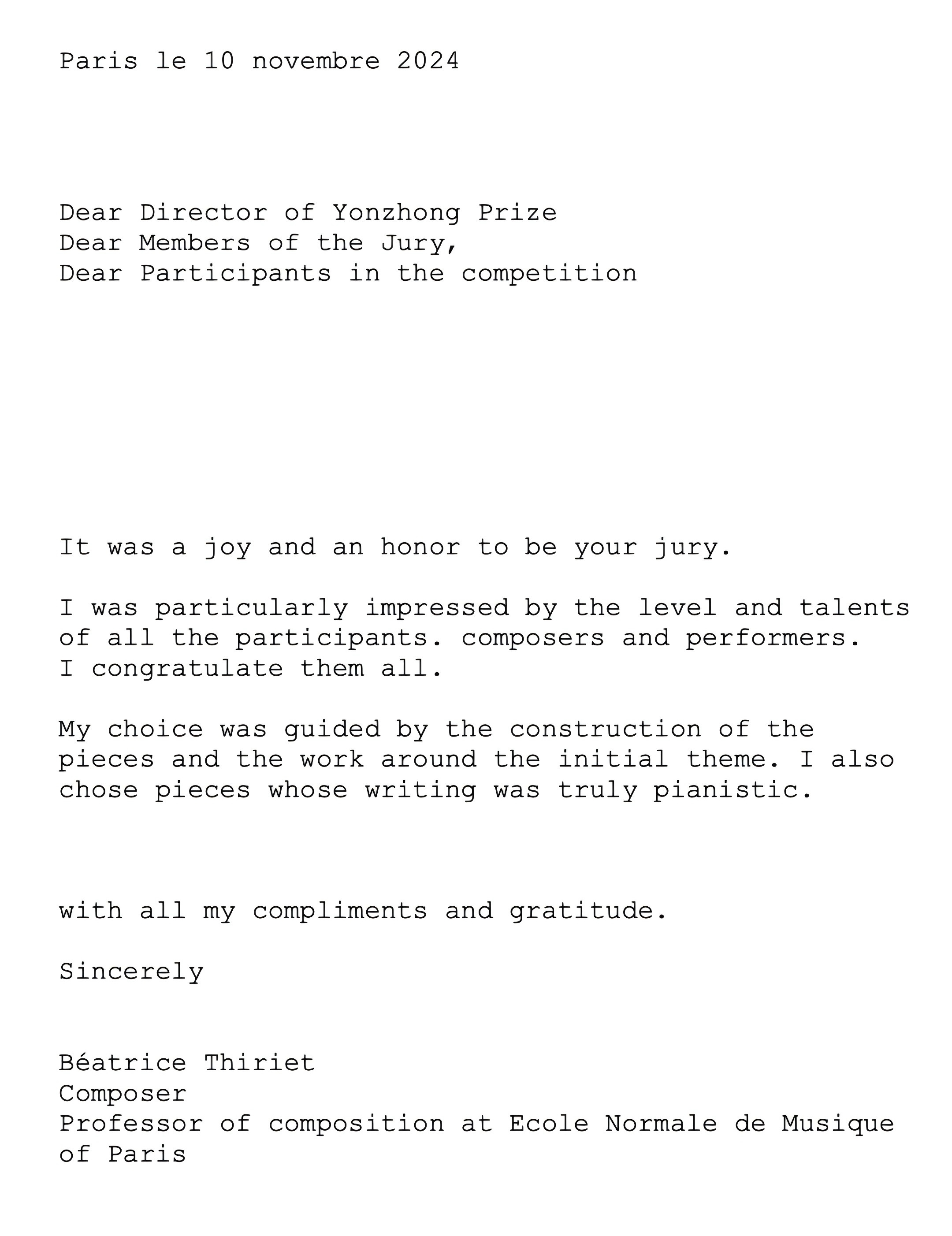 法国巴黎高等音乐师范学院作曲教授贝阿特丽斯·蒂里耶寄语