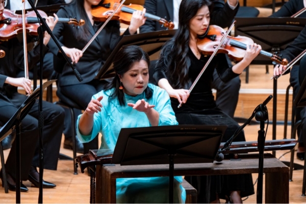 中国音乐学院作曲系青年教师王东旭创作的古琴、打击乐与弦乐队《清风》,托物言志,以乐抒怀,作品借“清风”意象歌颂国音前辈正直高尚、铮铮傲骨的精神品格。古琴与弦乐队构成虚实相间、动静结合的音响画面,呼应着中国古人寄情于山水和自然万物,追求心性、自由洒脱的精神境界。担任演奏的是古琴演奏家、中国音乐学院副教授、硕士研究生导师黄梅。她的演奏大气磅礴,音色处理细腻入微,情感真挚。