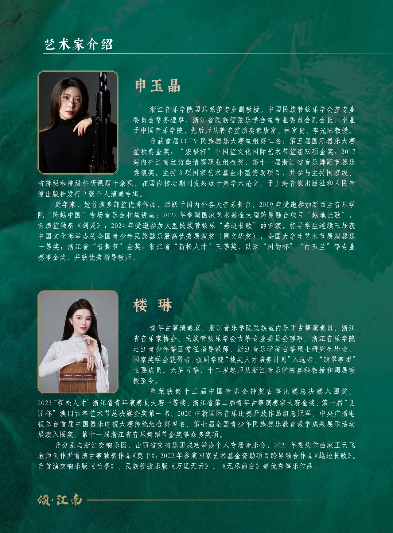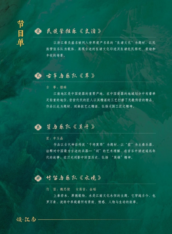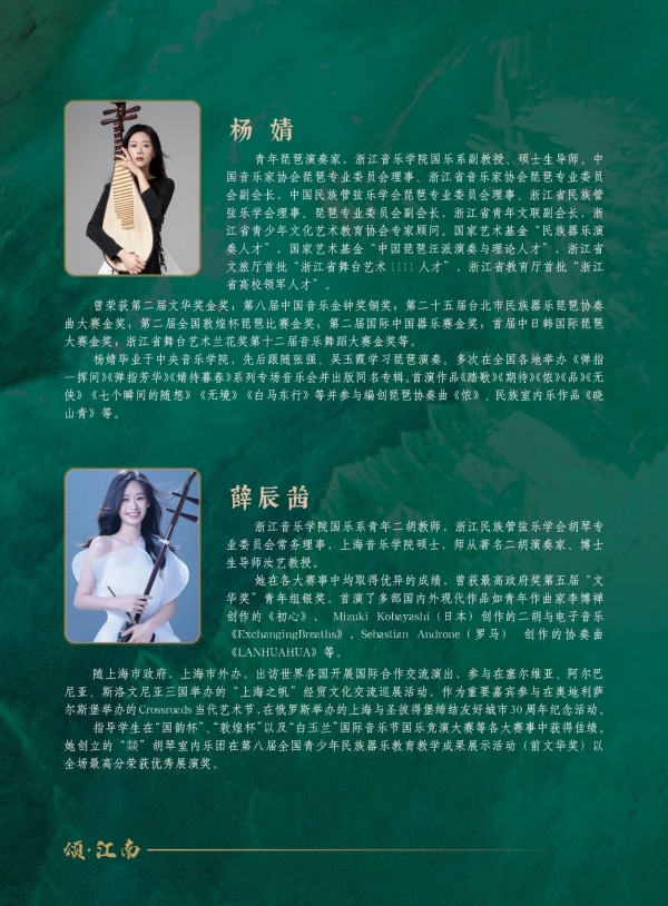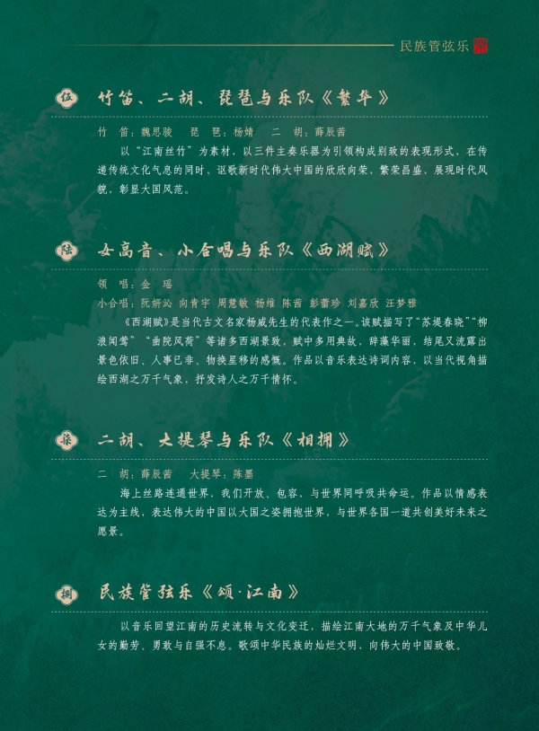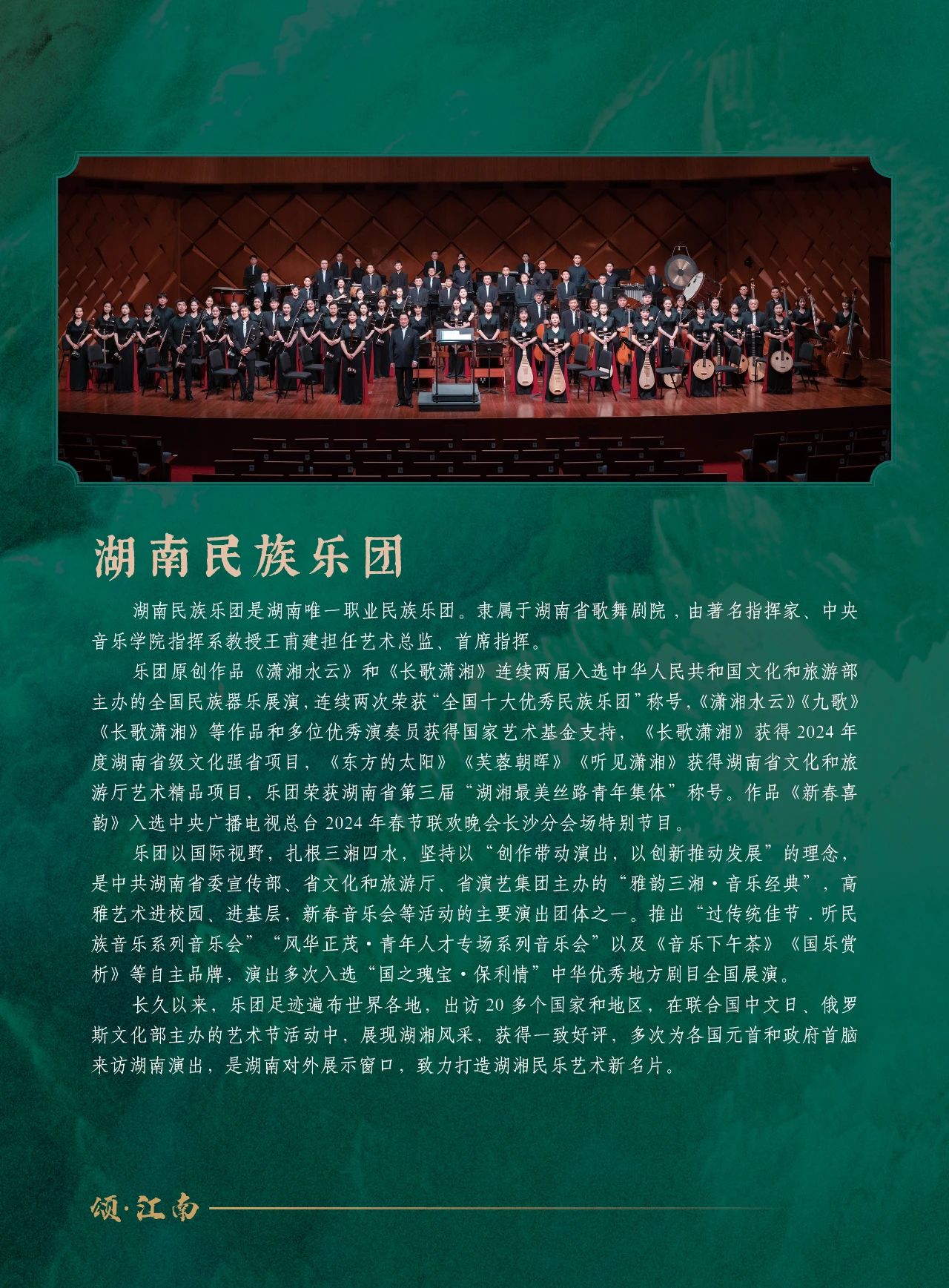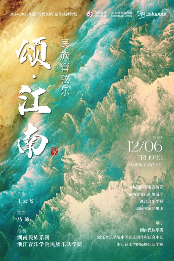 民族管弦乐《颂·江南》由浙江音乐学院中国音乐创作和研究中心创作,获批文化和旅游部2024-2025年度“时代交响”扶持计划扶持作品。《颂·江南》以江南文化为宏观题材,选取其中具有代表性的历史、人文、自然等文化符号为子题材,以从古至今的历史更迭为脉络,融民歌、戏曲、民族民间音乐等元素为一体,是一部具有厚重文化底蕴的、鲜活时代气息的、内容丰富、形式多样的,既传承优秀传统文化又歌颂当今中国万千气象,彰显大国风范的大型民族管弦乐作品。本场音乐会由浙江音乐学院民族乐队学院与湖南民族乐团联袂上演,由青年指挥家马帅执棒,由浙江音乐学院优秀教师团队担纲主演,将为观众献上一部既具艺术品味,又好听好看的民族音乐佳作。