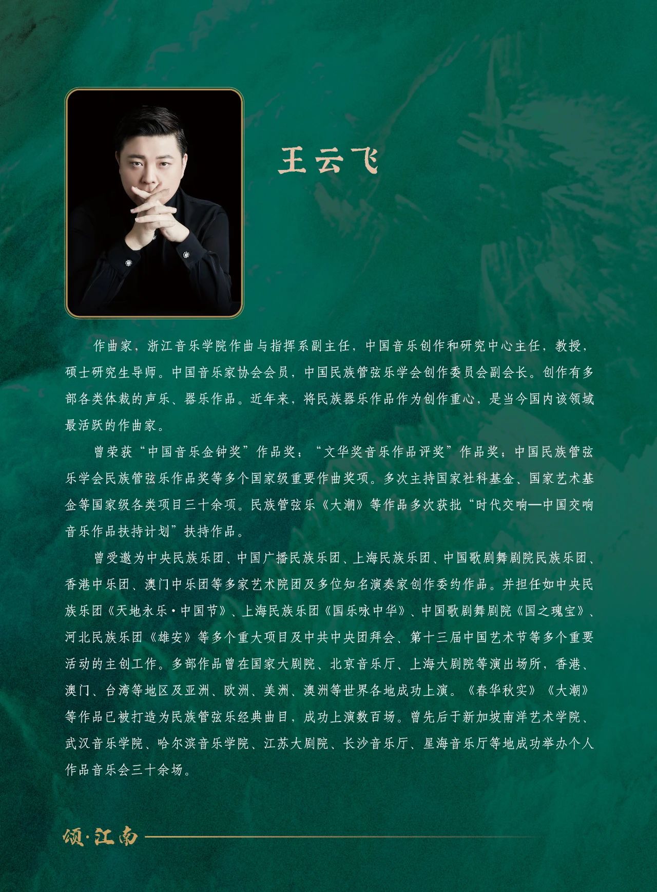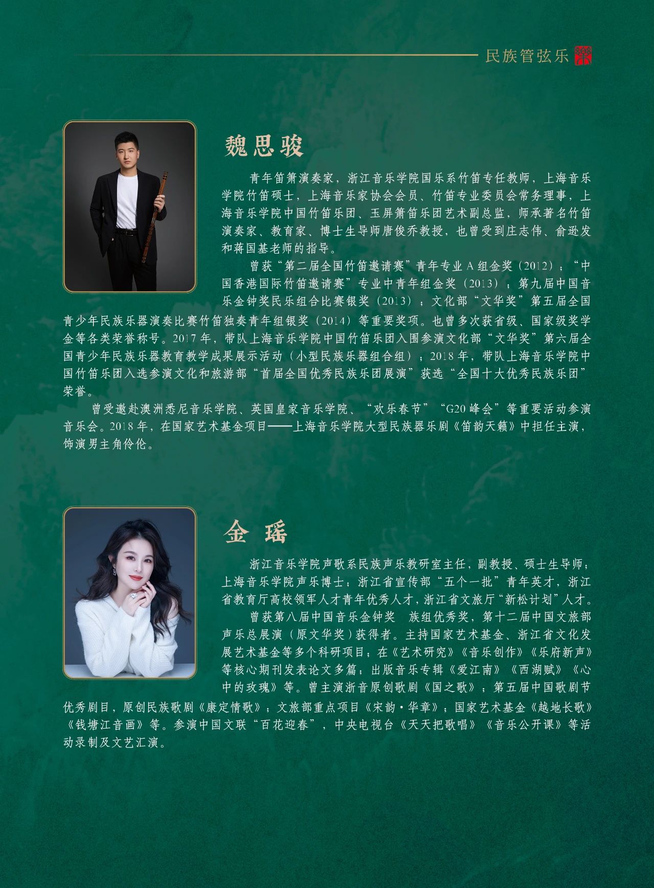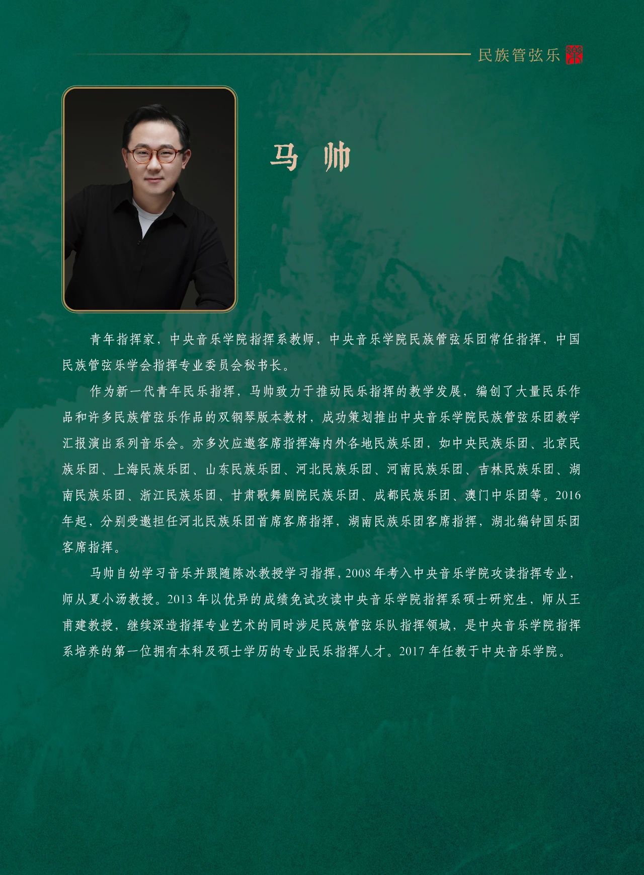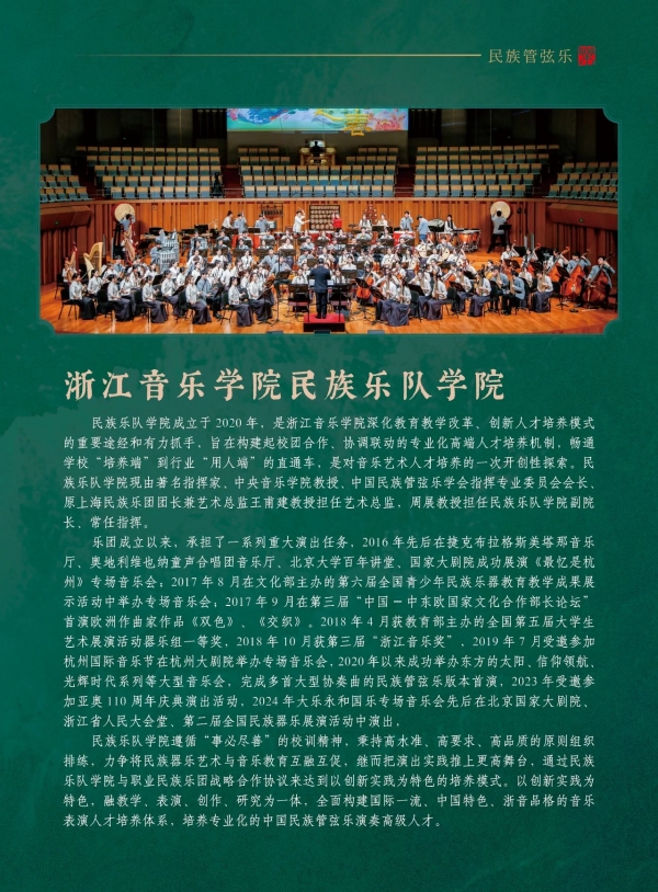 民族管弦乐《颂·江南》由浙江音乐学院中国音乐创作和研究中心创作,获批文化和旅游部2024-2025年度“时代交响”扶持计划扶持作品。《颂·江南》以江南文化为宏观题材,选取其中具有代表性的历史、人文、自然等文化符号为子题材,以从古至今的历史更迭为脉络,融民歌、戏曲、民族民间音乐等元素为一体,是一部具有厚重文化底蕴的、鲜活时代气息的、内容丰富、形式多样的,既传承优秀传统文化又歌颂当今中国万千气象,彰显大国风范的大型民族管弦乐作品。本场音乐会由浙江音乐学院民族乐队学院与湖南民族乐团联袂上演,由青年指挥家马帅执棒,由浙江音乐学院优秀教师团队担纲主演,将为观众献上一部既具艺术品味,又好听好看的民族音乐佳作。