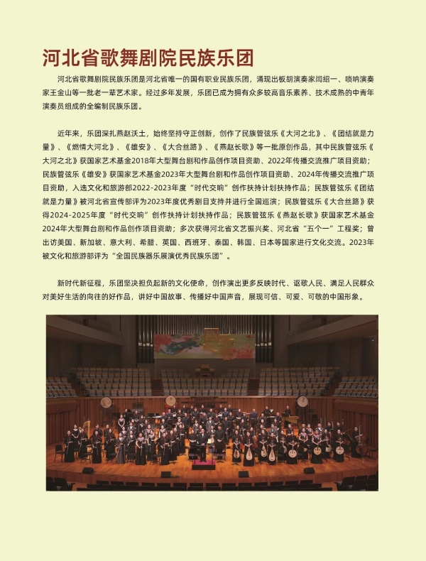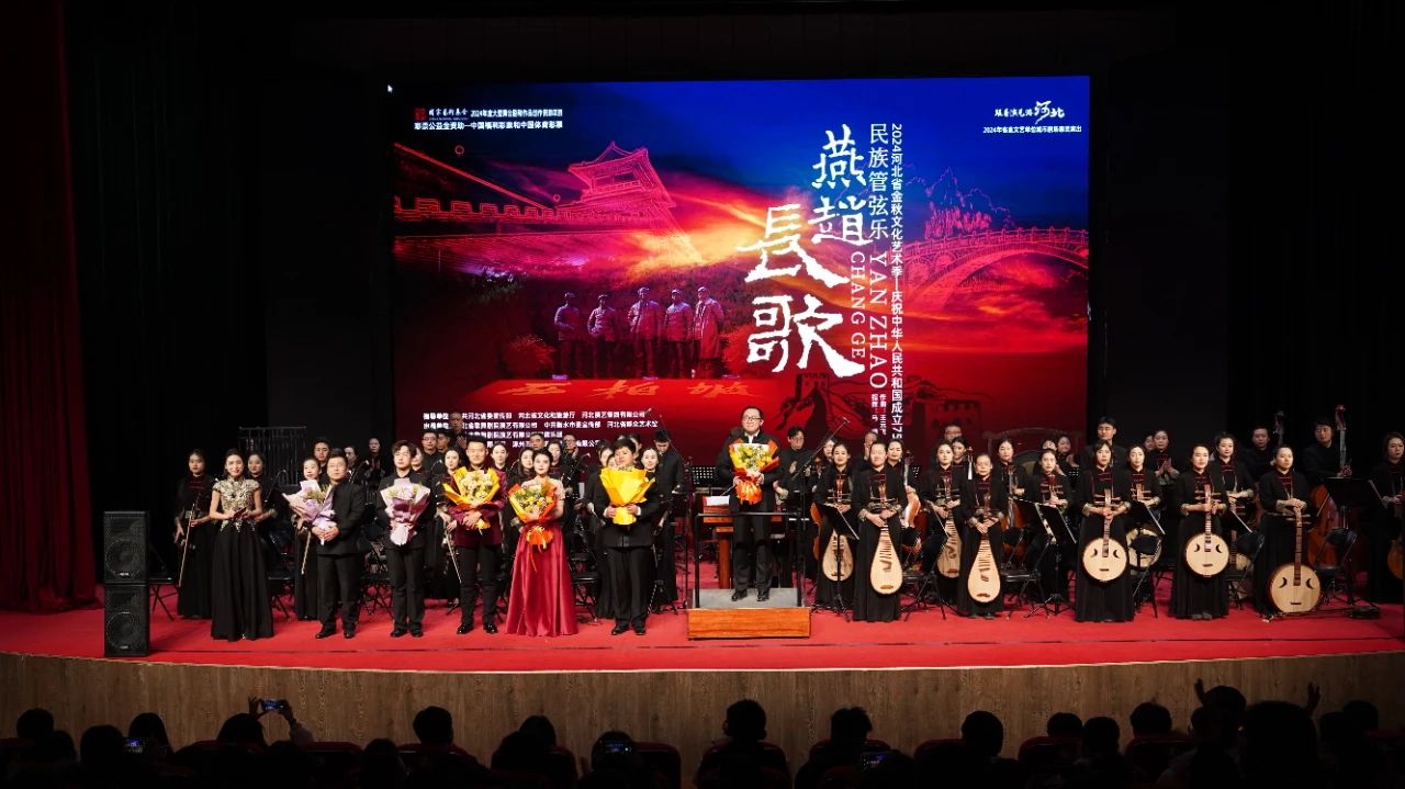 2024年11月29日,民族管弦乐《燕赵长歌》在石家庄信息工程职业学院成功演出。至此,由中共河北省委宣传部、省文化和旅游厅、省演艺集团指导,河北省歌舞剧院、中共衡水市委宣传部、省群艺馆联合打造,于2024年9月27日在衡水首演的国家艺术基金2024年度大型舞台剧和作品创作资助项目民族管弦乐《燕赵长歌》圆满收官!
