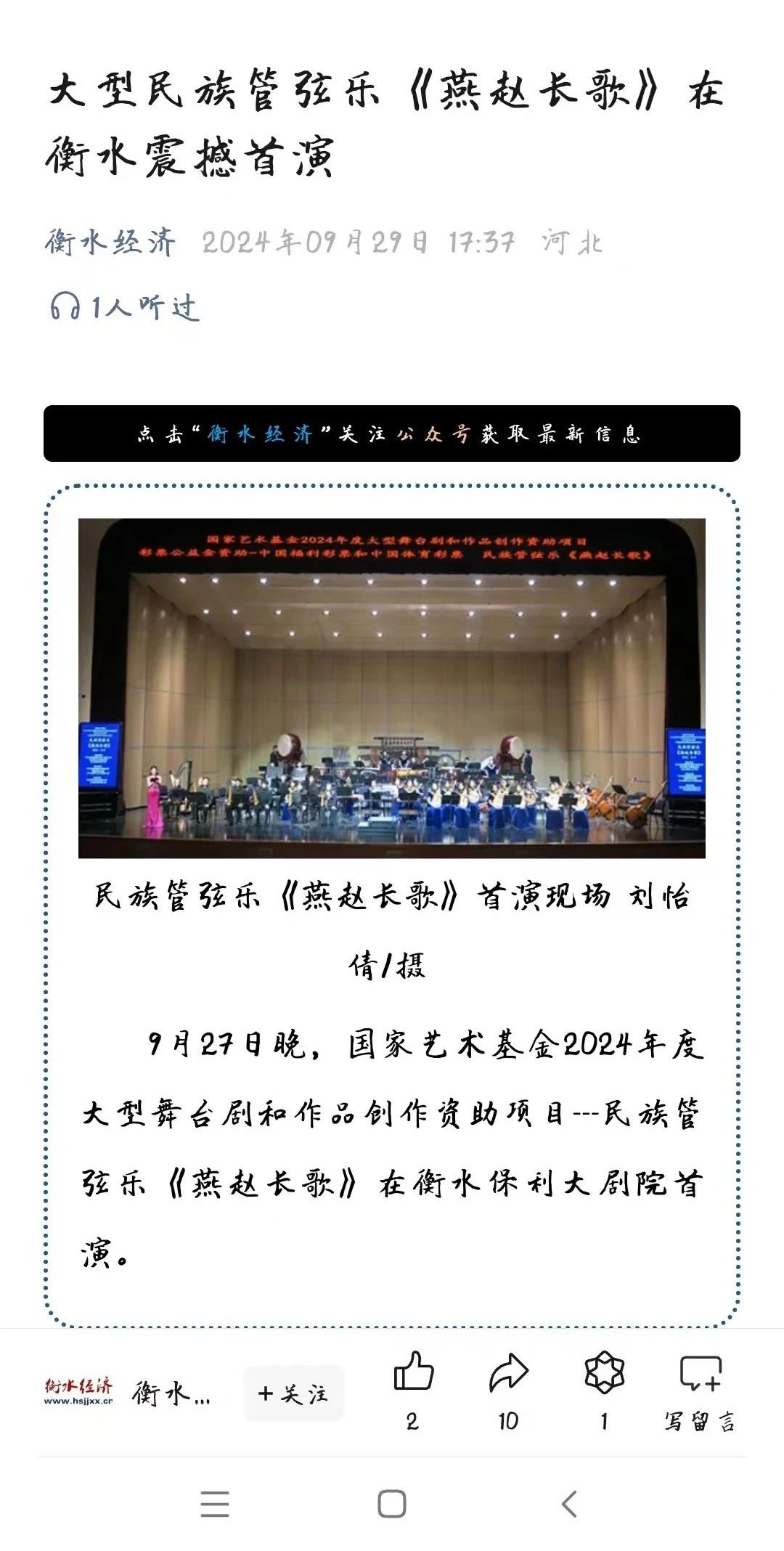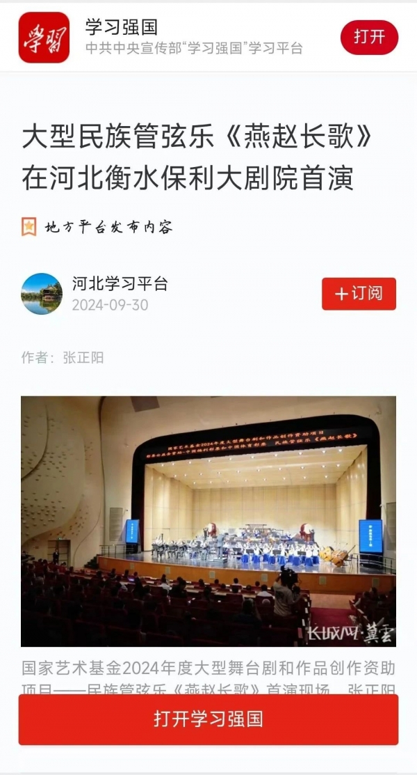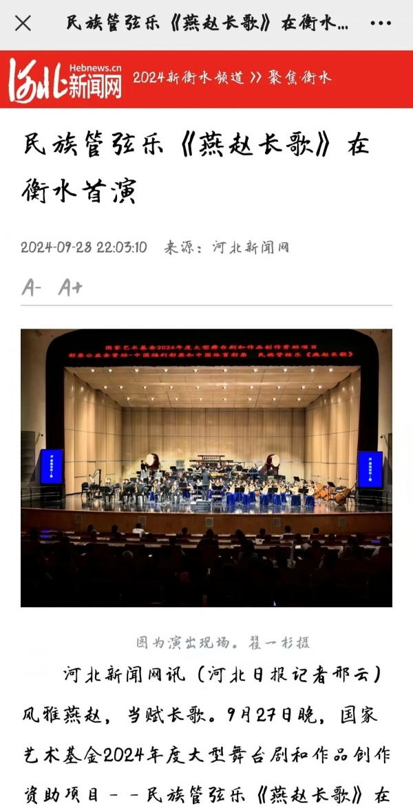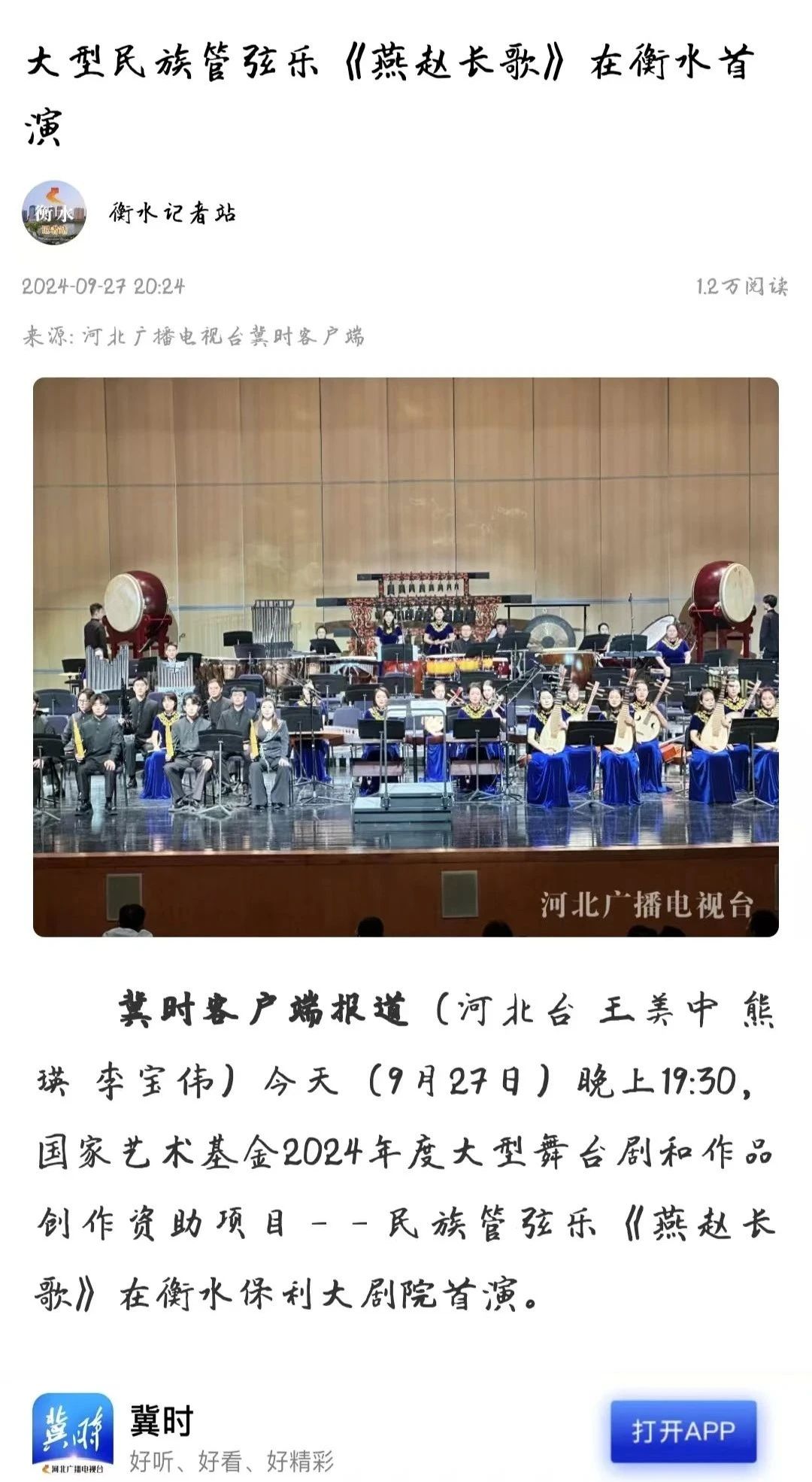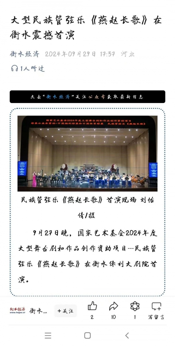 民族管弦乐《燕赵长歌》2024年9月27日在衡水保利大剧院首演之后,先后走进石家庄大剧院、河北省群艺馆虹光剧场、河北交通职业技术学院、石家庄信息工程职业学院以及“河北公共文化云”平台线上演出10场,得到现场观众、线上观众的高度评价和肯定,创作演出取得圆满成功!