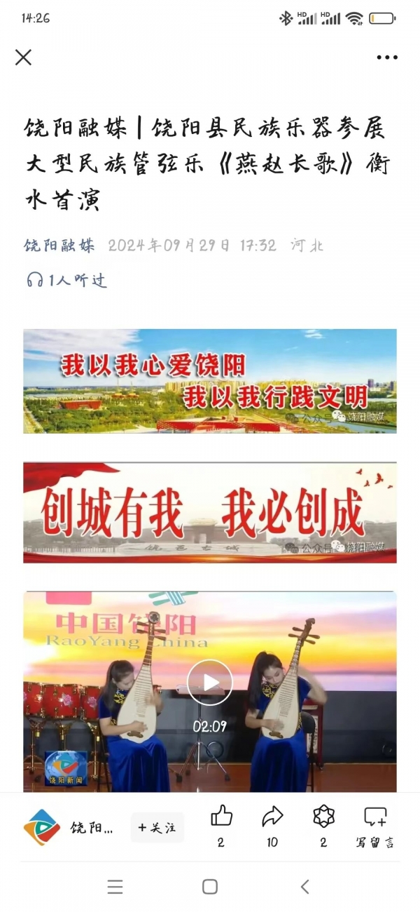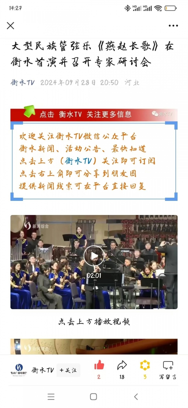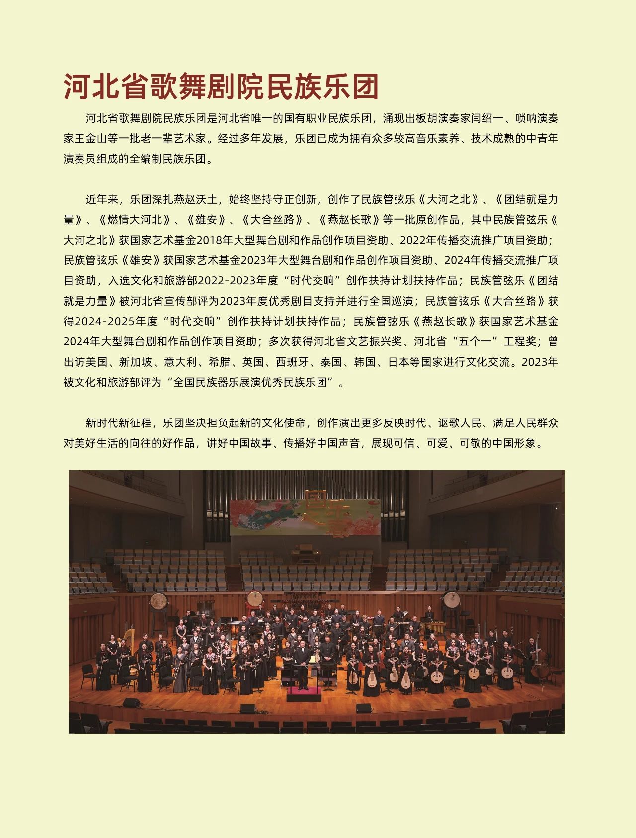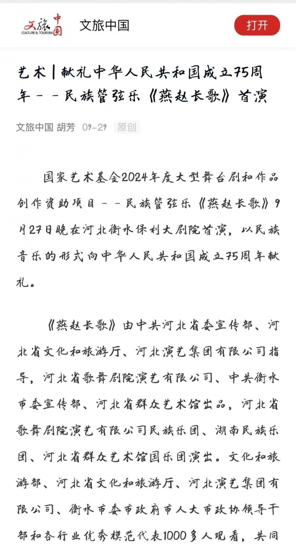 民族管弦乐《燕赵长歌》2024年9月27日在衡水保利大剧院首演之后,先后走进石家庄大剧院、河北省群艺馆虹光剧场、河北交通职业技术学院、石家庄信息工程职业学院以及“河北公共文化云”平台线上演出10场,得到现场观众、线上观众的高度评价和肯定,创作演出取得圆满成功!