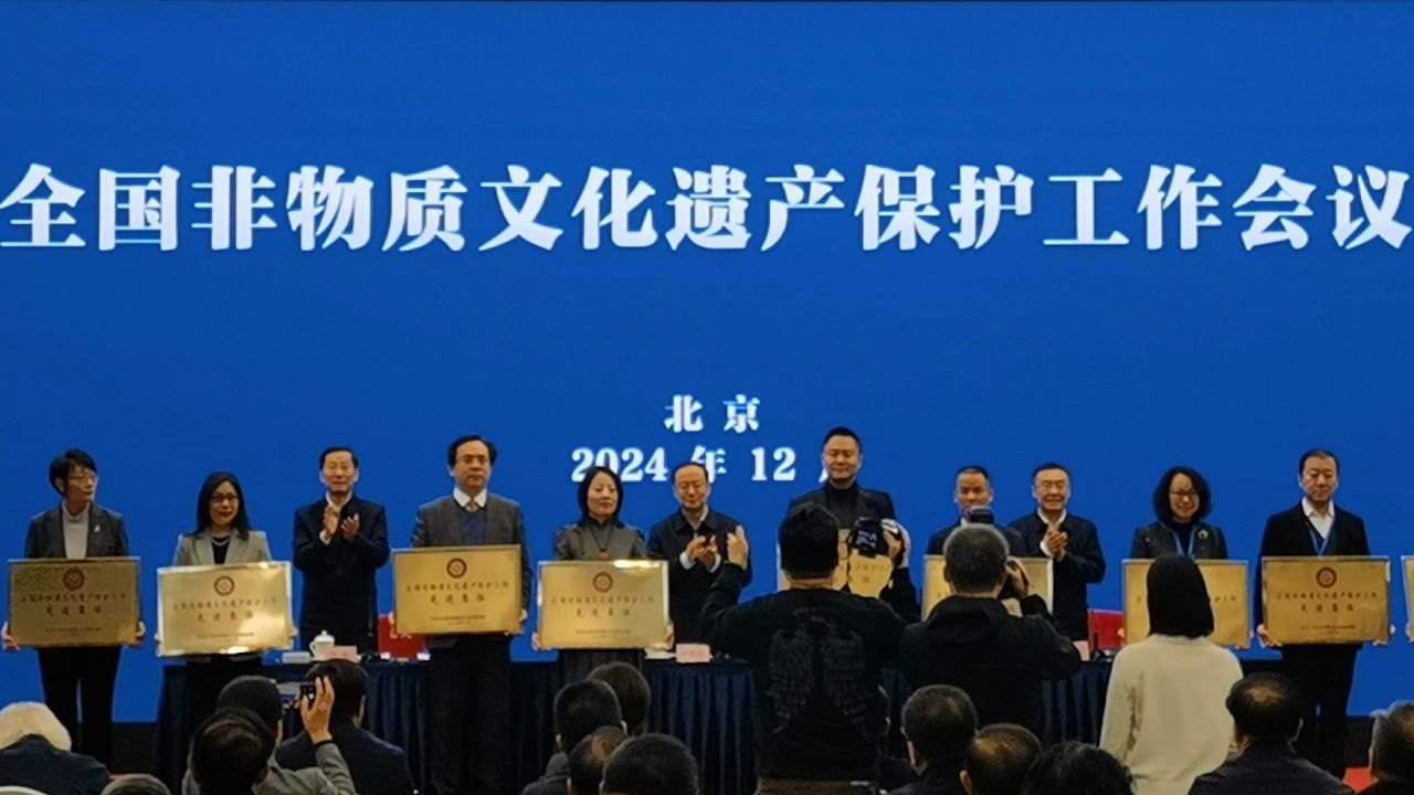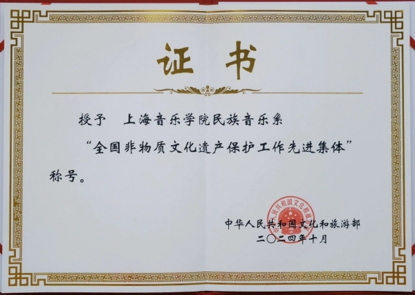 2024年12月23日,全国非物质文化遗产保护工作会议在北京召开,中宣部副部长,文化和旅游部党组书记、部长孙业礼,文化和旅游部副部长卢映川、饶权出席会议。会上为全国非遗保护工作先进集体代表授牌,为全国非遗保护工作先进个人代表颁发奖章、证书。上海音乐学院民族音乐系荣获“全国非物质文化遗产保护工作先进集体”称号。