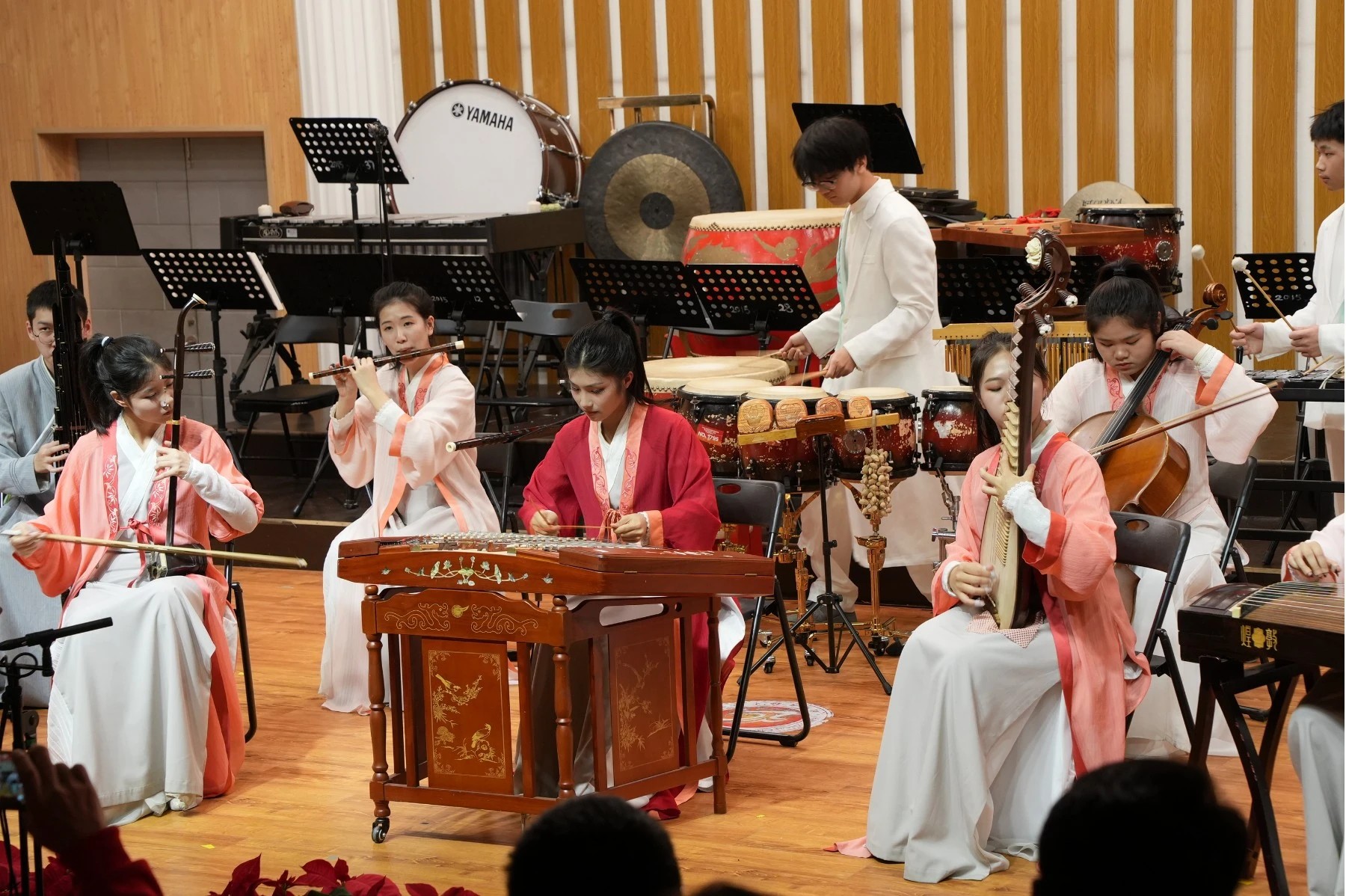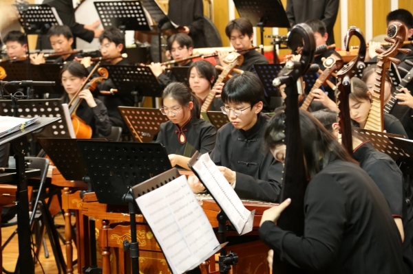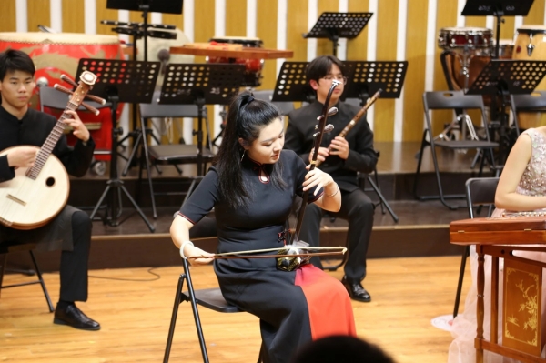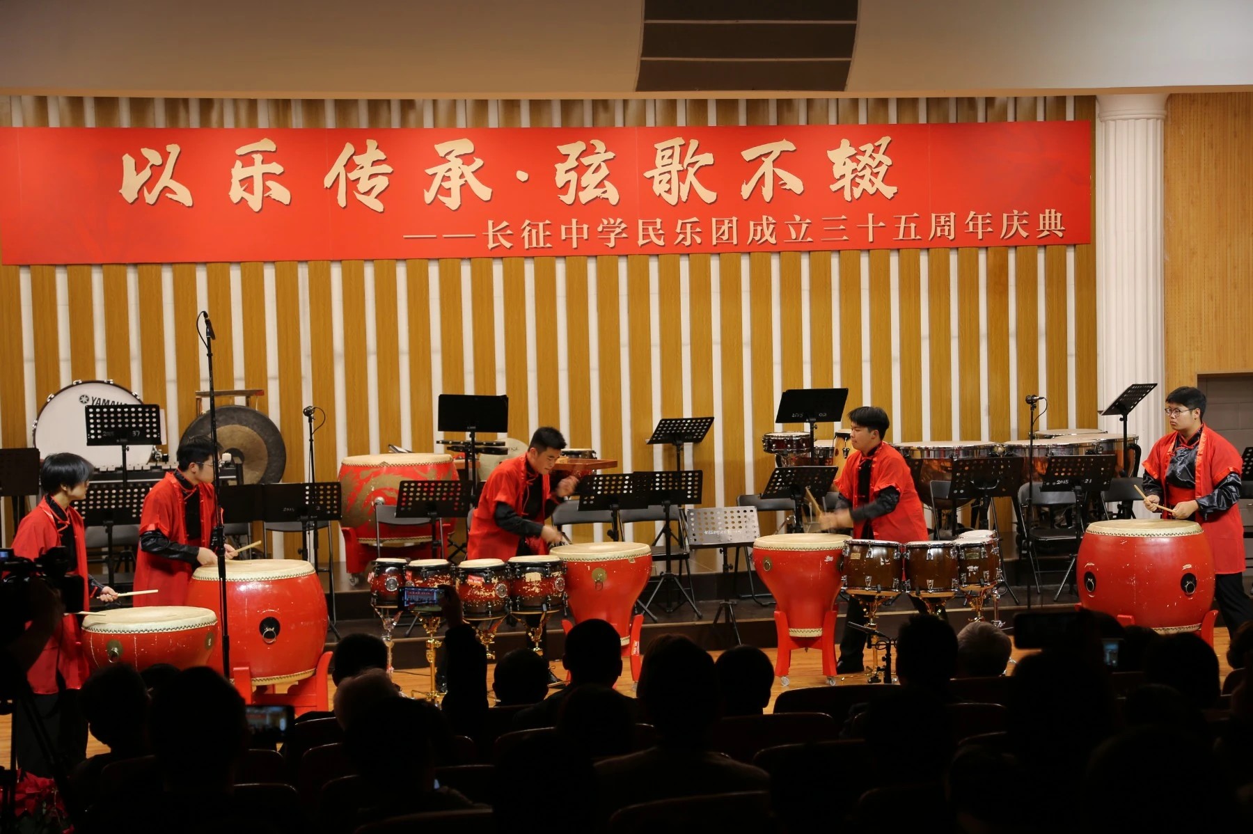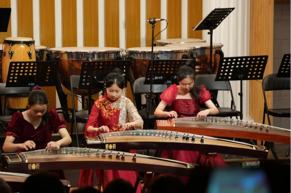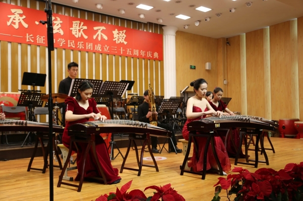 音乐会上,长征中学民乐团演奏了《征程》《红楼梦组曲》《狮城序曲》《龙腾虎跃》等乐曲,大鼓、竹笛、二胡、琵琶、古筝等民族乐器齐上阵。