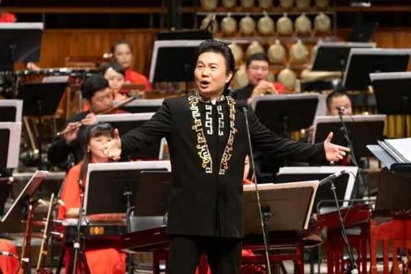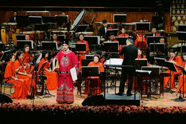 随后,歌唱家吴哲铭与乐团共同带来了三首声乐作品。《苏武牧羊》歌颂了苏武的民族气节,寄托了高尚的家国情怀。《阳关三叠》原曲是根据王维诗《送元二使安西》谱写的琴歌,作为一首以中国传统诗词为题材的经典作品,人们已经耳熟能详,但经过作曲家戚浩笛的重新编曲,让这首作品有了更浓烈的情感。乐队泛调性的创作手法带来的疏离感,似乎暗示着与友人的分别;主题的三次呈现中,乐队做了不同层次的推动,将送别的万般不舍、殷殷嘱托展现地淋漓尽致。王洛宾先生所作的《马车夫之歌》(达坂城的姑娘),在重新编曲后,融合了爵士乐风格与新疆地区的音阶,摇摆的律动更添风趣与幽默。吴哲铭的嗓音浑厚圆润、清晰扎实,如朗诵般的吐字声声入耳,细腻的情绪转换,将各种音乐形象生动演绎,赢得了在场听众的阵阵掌声。