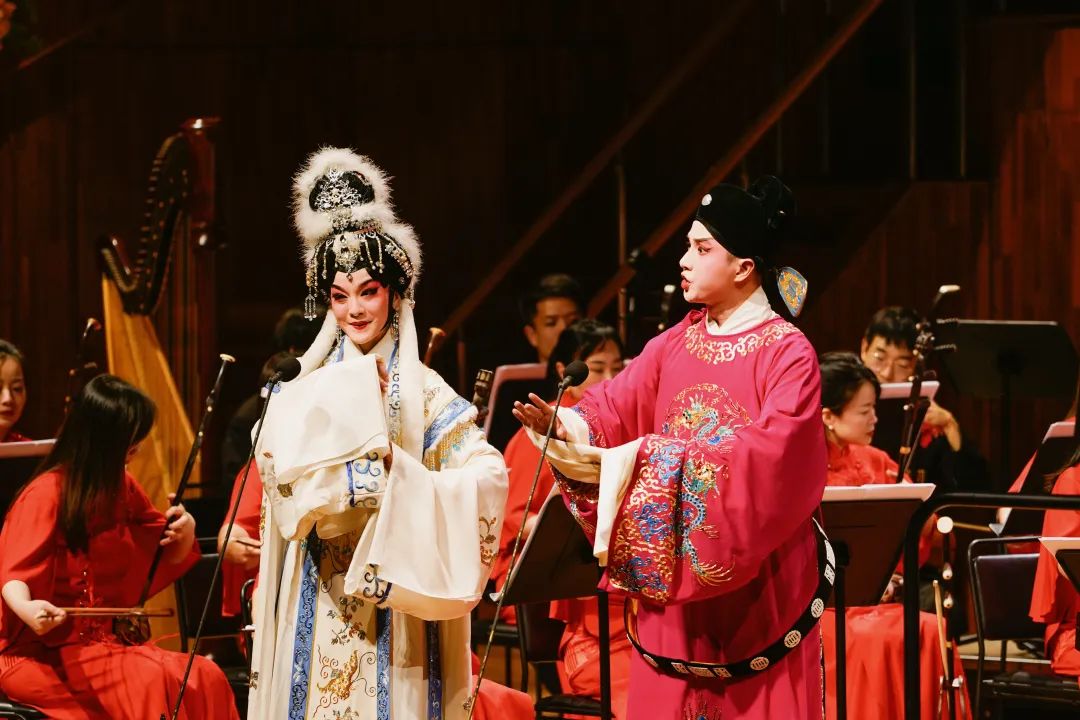 接下来三首广东汉剧的经典选段,展现了中国戏曲文化的精粹。《昭君行·忆香溪》表达了王昭君对故土的思念、身不由己的无奈,《北楼会》讲述了书生高文举被权贵逼婚,一番曲折后终与妻子团圆的故事,《盘夫》是妻子对丈夫的真情吐露。管乐莹的声音甜美、纯净且极有穿透力。邓振鹏一张口便“技惊四座”——他使用“高腔”演唱。在很多北方戏曲音乐如河北梆子中也有高腔,但汉剧的高腔较北方的豪放更多一分细腻柔和,在相当高的音域对音色还有如此掌控力,实在令人惊叹。二人从后台走出直到下台,手、眼、身、法、步一招一式都尽显汉剧的典雅气派。