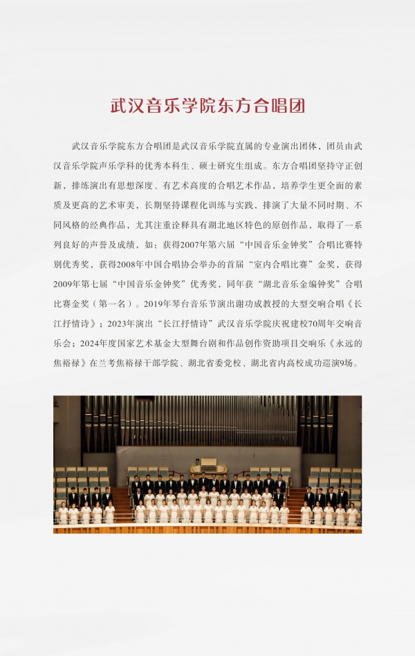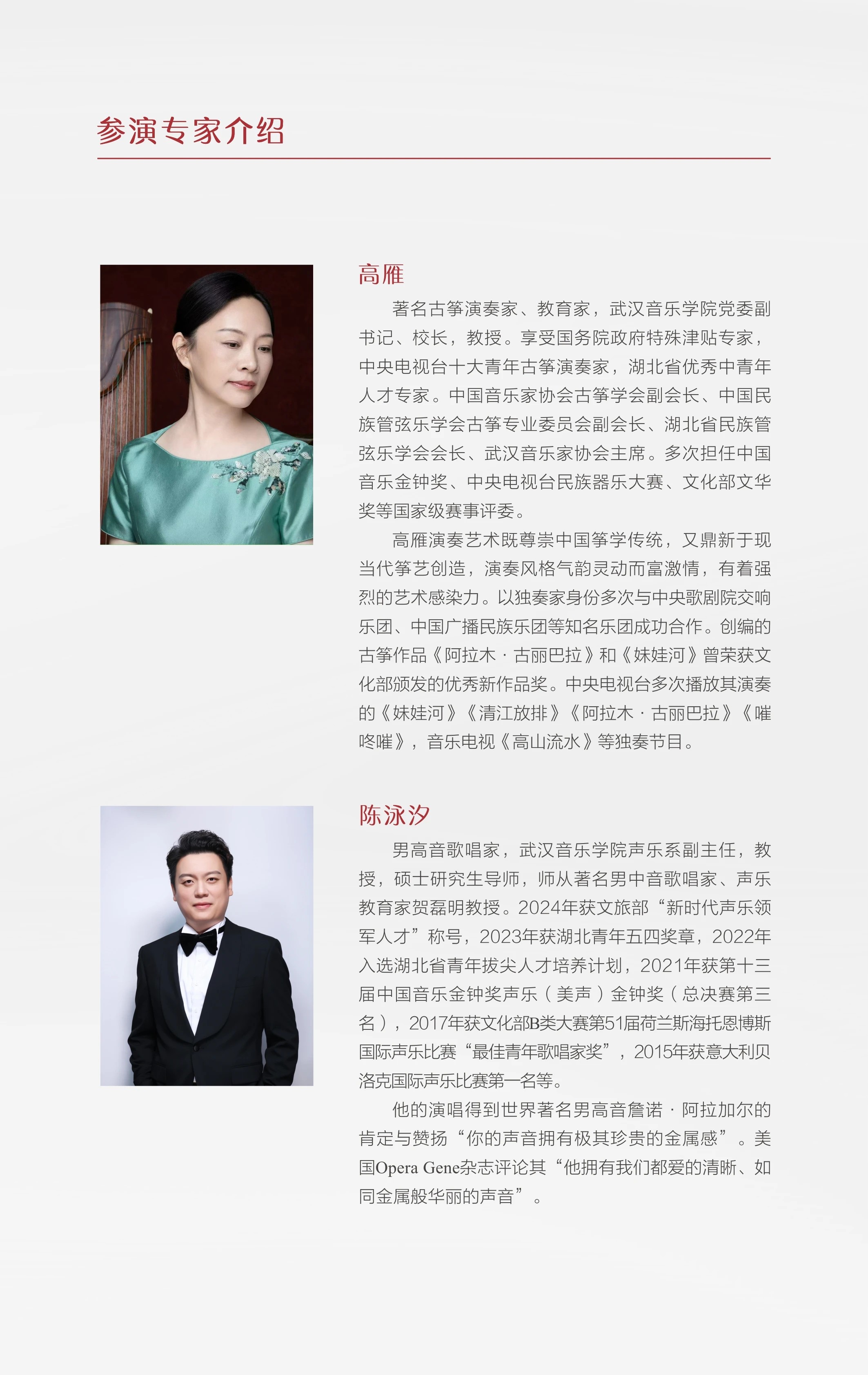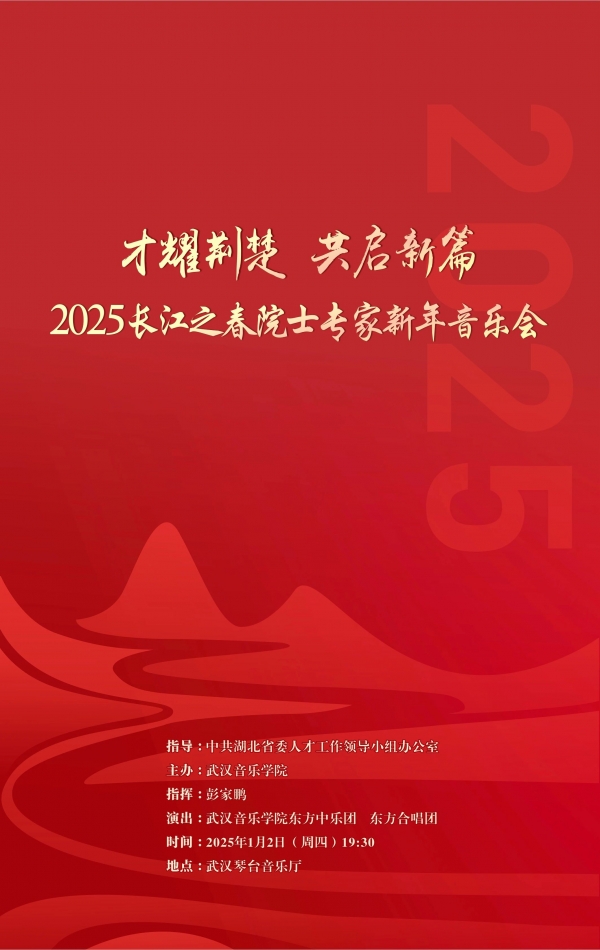 由中共湖北省委人才工作领导小组办公室指导,武汉音乐学院主办的“才耀荆楚 共启新篇”——2025长江之春院士专家新年音乐会 将于今晚19:30在武汉琴台音乐厅隆重上演。同时,本场音乐会将通过“央视频”“武音艺术实践”视频号同步直播。