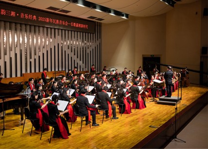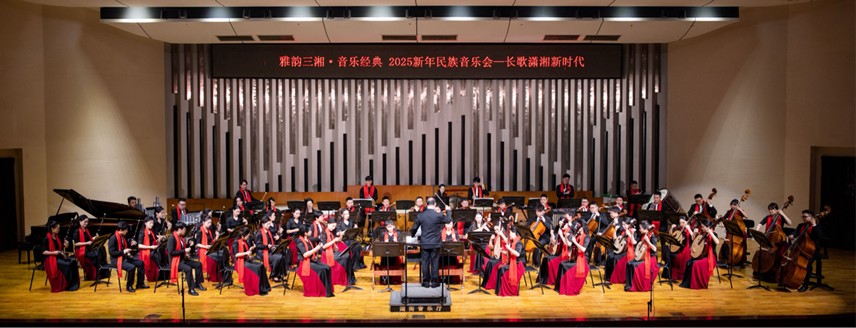2024年12月29日晚,“雅韵三湘·音乐经典”———2025湖南新年民族音乐会在湖南音乐厅上演,湖南民族乐团奏响新时代潇湘之声,用浸润中华民族血脉基因的音乐送别过去的一年,迎接2025年新年到来。关怀乐团成长的各级领导,社会各界人士与星城观众一起,共享民乐之美,现场深情涌动,掌声如潮。