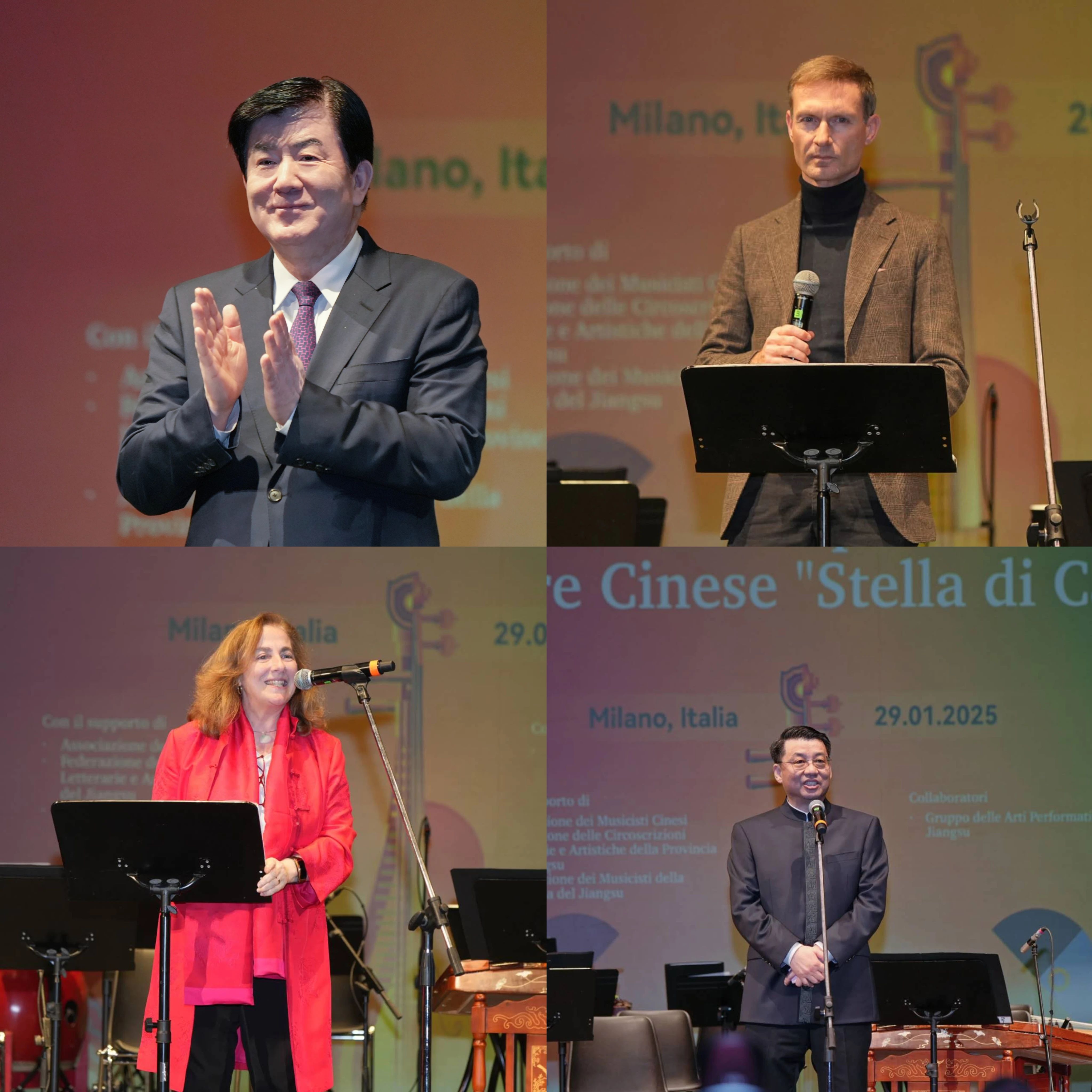 活动由中国文联、中国驻米兰总领馆、意中协会主办,中国音协、江苏省文联、江苏省音协承办。演出前,由中国驻米兰总领事刘侃陪同,中国文联党组书记、副主席李屹会见了意大利伦巴第大区议长罗马尼,米兰市议员、市政府代表德马基,米兰大都会副市长瓦萨洛,米兰市议会文化委员会主席科斯塔马亚,意中理事基金会主席博塞利和意中协会主席罗莎等嘉宾,向他们致以新春的问候,希望双方在习近平主席和马塔雷拉总统共同引领下,弘扬开放包容、兼容并蓄的传统,持续深化人文交流和文明互鉴,促进两国人民相知相亲相融,携手构建和合共生的美好世界。李屹宣布2025“今日中国”艺术周开幕,刘侃、罗马尼、罗莎致辞,米兰政府、议会、文化、政党、教育、民间各界人士、当地华人华侨等千余名观众欣赏了中国民乐演出。
