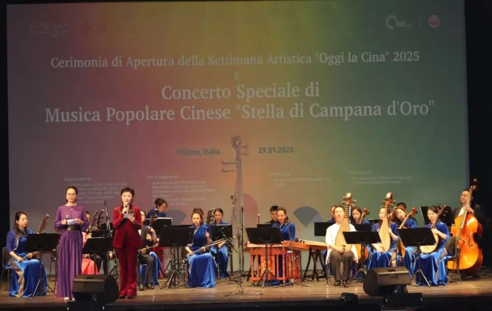 当地时间1月29日,2025“今日中国”艺术周开幕式暨“金钟之星”中国民族音乐专场演出于春节当晚在意大利米兰卡尔卡诺剧院隆重举办。该活动是庆祝中国和意大利建交55周年的一项重要内容,也是中国在世界各地举办的“欢乐春节”活动的组成部分。这是“今日中国”艺术周首次在意大利举行。