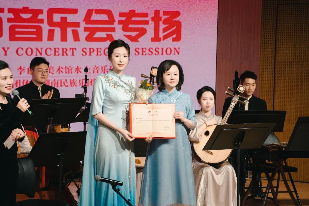 音乐会中,湖南民族乐团团长曹鹏为湖南工商大学音乐学院青年琵琶教师韩新星颁发乐团“客席琵琶演奏家”聘书。