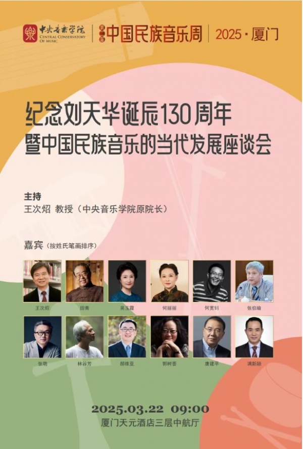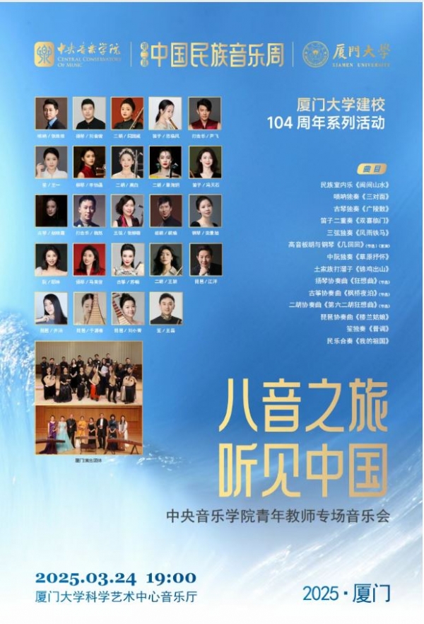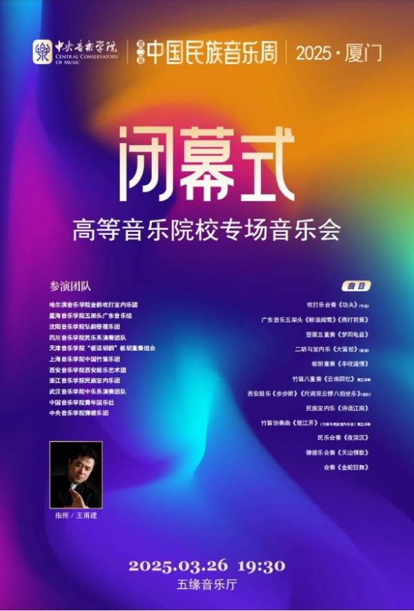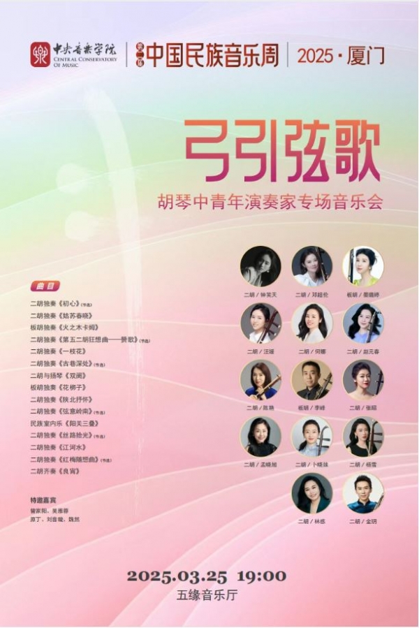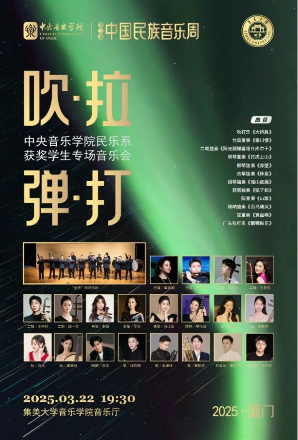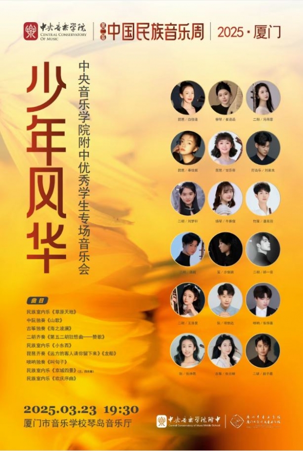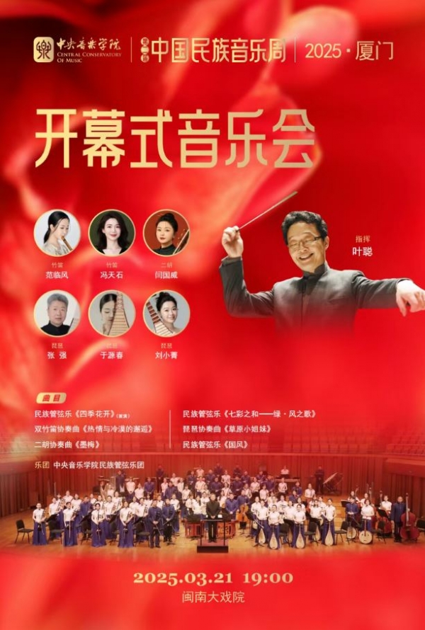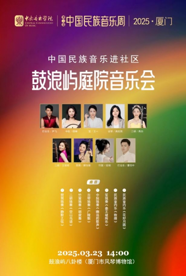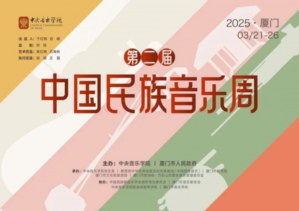 第二届中国民族音乐周(2025·厦门)将于3月21日-26日在厦门举办。本届民族音乐周由中央音乐学院、厦门市人民政府共同主办,中央音乐学院民乐系、教育部中华优秀传统文化传承基地(中国民族音乐)、厦门市教育局、厦门市文化和旅游局、厦门市鼓浪屿-万古山风景名胜区管理委员会承办,中国民族管弦乐学会胡琴专业委员会、厦门市音乐家协会、中央音乐学院鼓浪屿钢琴学校、厦门市音乐学校协办。