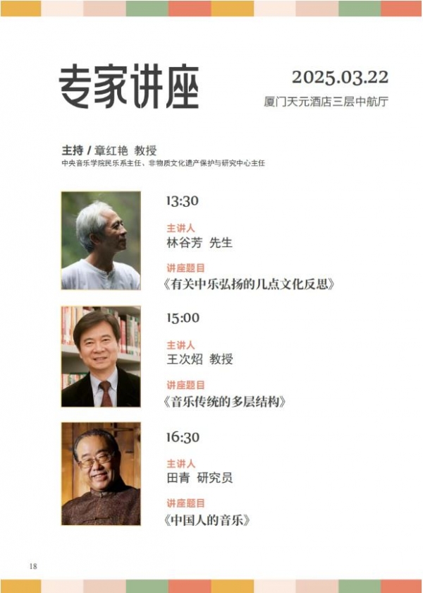 学术传承、活态保护与创新发展是民族音乐薪火相传的三大支柱,专家讲座和座谈会作为本届民族音乐周的理论基石,通过名家学者的主题研讨和深度对话,持续激活传统音乐文化的当代生命力。“纪念刘天华诞辰130周年暨中国民族音乐的当代发展座谈会”和专家讲座的嘉宾汇集了中央音乐学院教授、原院长王次炤,音乐学家、非物质文化遗产保护专家田青,文化学人、音乐家林谷芳,琵琶演奏家、中国民族管弦乐学会会长吴玉霞,作曲家唐建平等各个领域的重要力量,既聚焦于传统音乐人文精神的时代诠释与创新表达,又通过系统性、全方位、多层次的学术研讨构建民族音乐当代发展的理论框架。