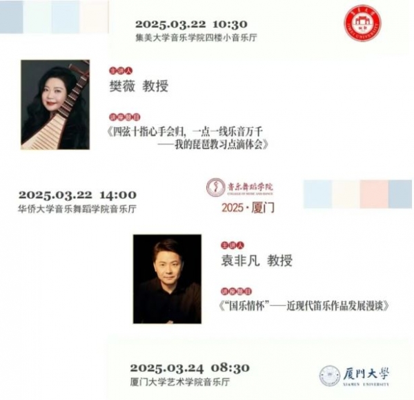 “中国民族音乐进校园、进社区”是对此次民族音乐周宗旨的全面践行。中央音乐学院一直致力于充分发挥文艺的价值引导、精神引领、审美启迪作用,不断深化教育教学在加强和改进学校美育工作中的主渠道作用,合力打造大思政一体化育人新格局。突破首届民族音乐周的实践形式和受众群体,本届音乐周创新构建“大中小学+社区”的美育共同体,以厦门大学、华侨大学、集美大学为主体,进一步涵盖3所中小学百余名师生和社区群众广泛参与,通过音乐会、讲座等一体化、多维度浸润行动,实现跨地域、跨学段音乐教育资源的深度联动,让民族音乐从专业音乐院校走进大中小学教室、社区广场,真正飞入寻常百姓家。