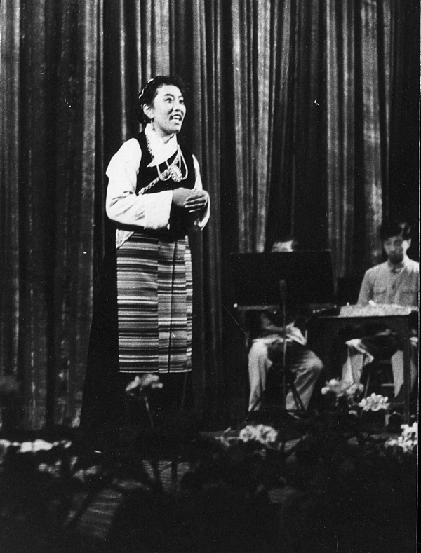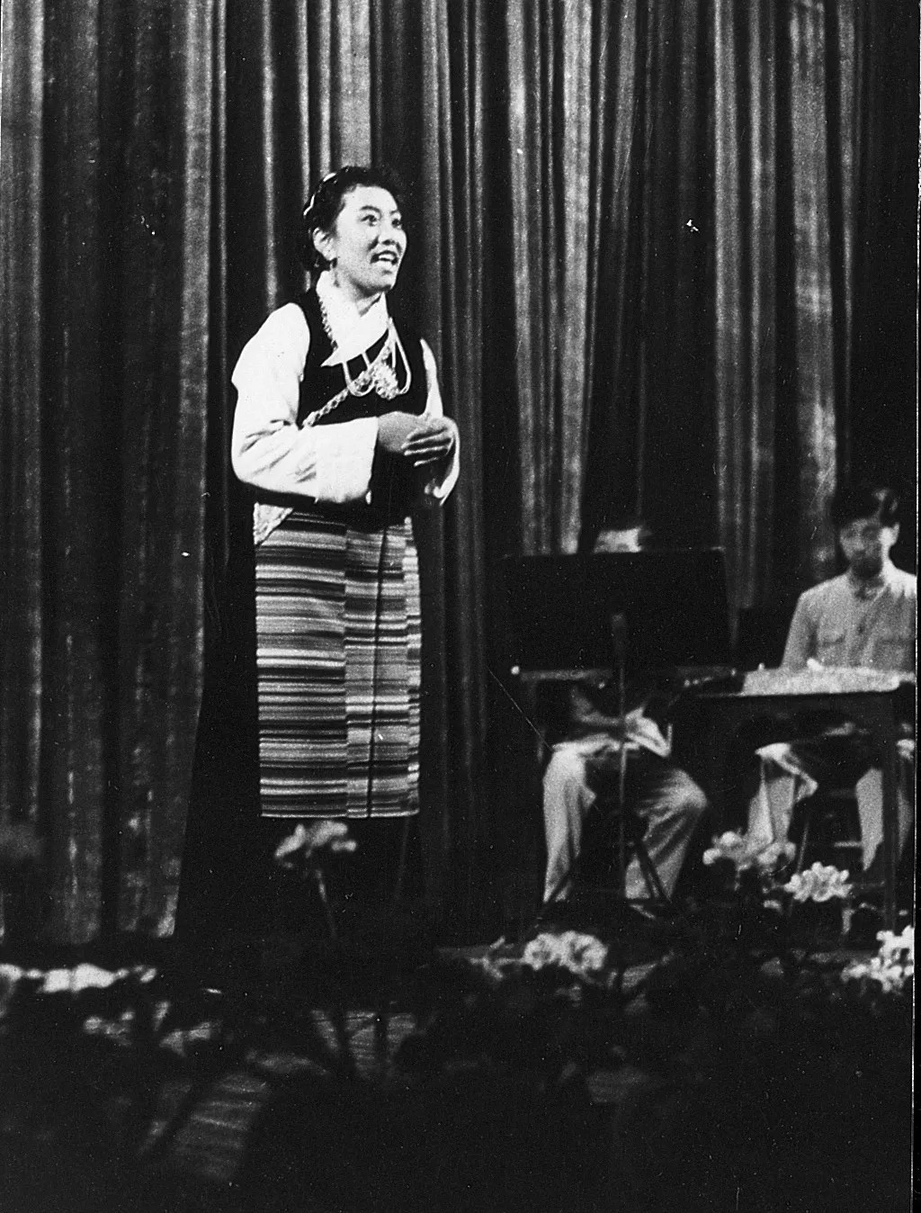 ▲1961年第2届“上海之春”,24岁的才旦卓玛独唱了由肖冷改编的歌曲《东方升起吉祥的太阳》(上图),独具特色的歌喉令人印象深刻。