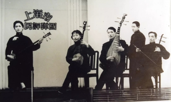▲1966年第7届“上海之春”, 余红仙(左一)等表演评弹《为女民兵题照》。