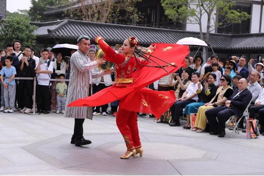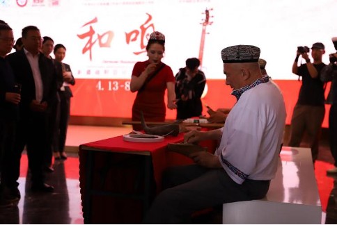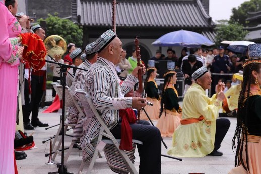 文化交流,音乐品鉴,共同发展,面向未来。2025年4月13日上午,“和鸣——新疆疏附县民族乐器展暨传统音乐推广季”开幕式在广州市文化馆举行。本次活动由广州市文化馆、星海音乐学院音乐博物馆、中共新疆疏附县委宣传部、疏附县文化体育广播电视和旅游局共同举办。星海音乐学院音乐博物馆吴家翠馆长、喻意副馆长一行出席了开幕式活动,来自新疆疏附县民间艺人的十二木卡姆歌舞节目表演精彩动人,赢得了在场嘉宾的阵阵掌声与热情喝彩。
