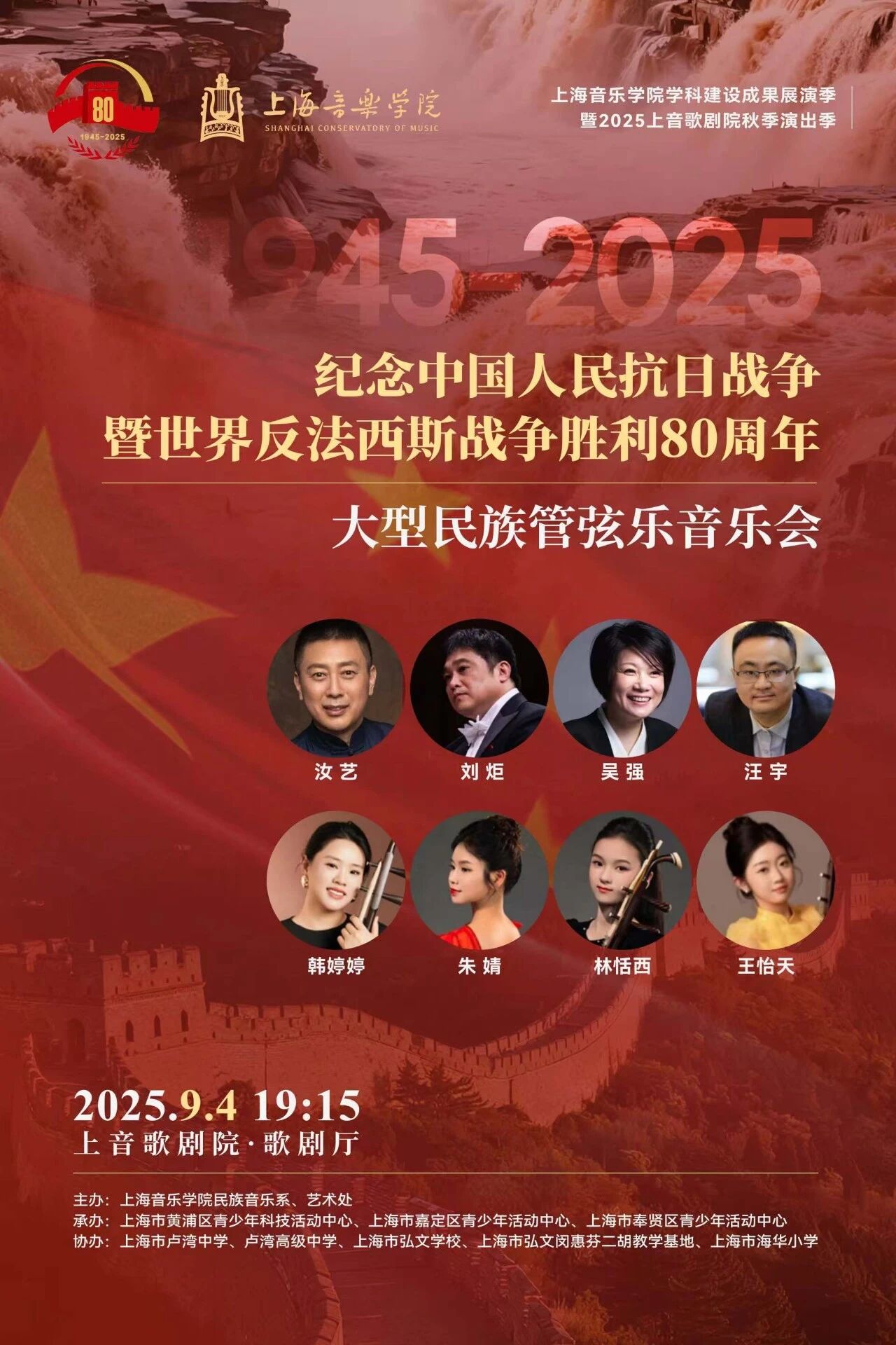 以音乐铭记历史,用旋律传承精神。9月4日晚,“纪念中国人民抗日战争暨世界反法西斯战争胜利 80 周年音乐会”在上音歌剧院奏响。此次音乐会由上海音乐学院民族音乐系、上海音乐学院艺术处,联合上海市黄浦区、嘉定区、奉贤区三地青少年活动中心共同举办,音乐同好们以弦为笔、以音为墨,在舞台上勾勒出民族抗争的壮阔画卷。