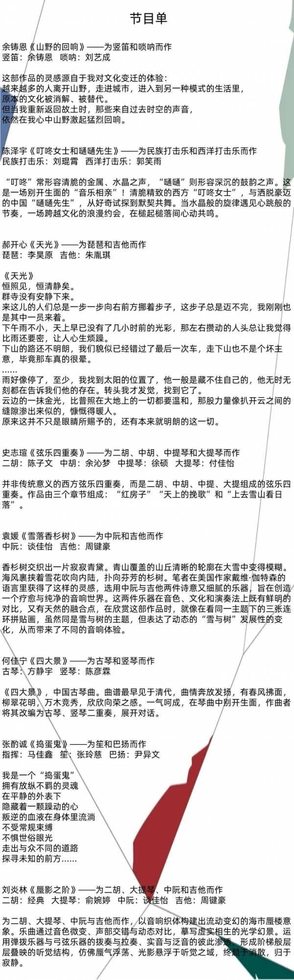 本场音乐会将上演8首形式各异的新作品,展现新生代作曲家非凡的创造力。让我们在每一首作品中感受中西文化的碰撞吧!