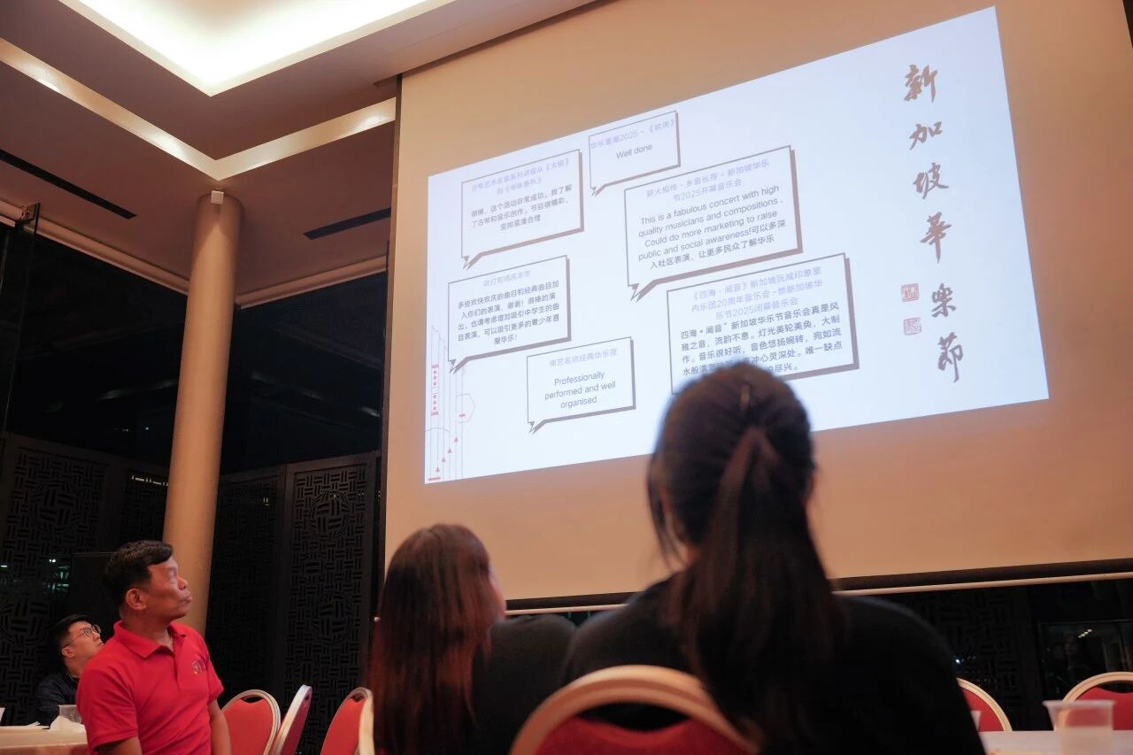 晚宴上,华乐节副主席林傅强博士详细汇报了本届华乐节的举办成果与社会反响。他指出,今年的活动吸引了近万名观众参与,媒体报道广泛,社会反响热烈,充分展现了华乐文化在新加坡社会中的活力与影响力。