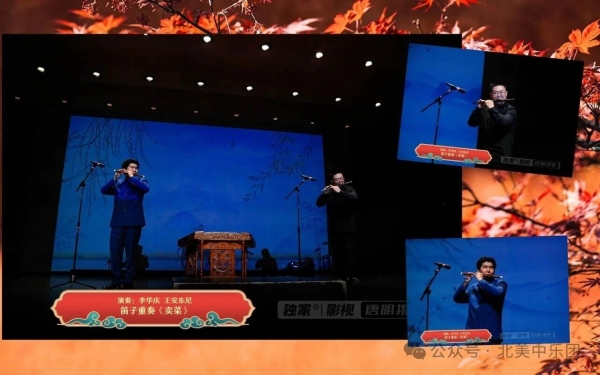 随后的笛子重奏《卖菜》由山东民歌改编,笛声轻快、节奏鲜明,生动描绘了集市上的热闹景象。两位笛子演奏家——毕业于中国音乐学院竹笛专业演奏硕士,跨界音乐人、青年笛萧演奏家李华庆先生和来自上海音乐学院青年才俊王安东尼先生默契配合、对答自然,同台竞技,笛音穿透剧场,清脆如泉、洒脱如风。观众无不被这份生机与幽默所感染,掌声与笑声交织成欢乐的回响。