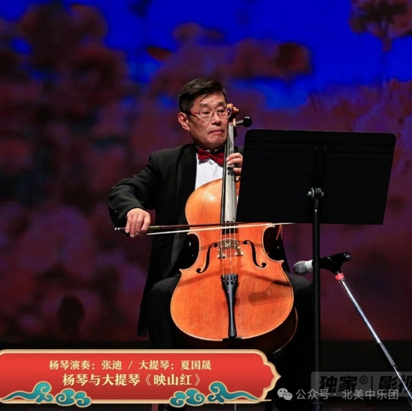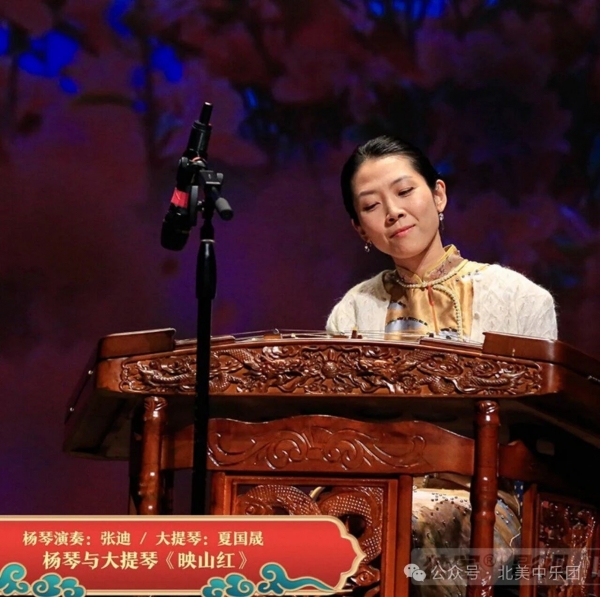 张迪老师带来的《映山红》以杨琴与大提琴的形式呈现,更是全场亮点之一。旋律深情、音色晶莹,杨琴细腻的拨弦仿佛在诉说红土地上的思念与坚韧。杨琴清脆明快的音色与大提琴低沉醇厚的音质相互交融,仿佛山花在晨曦中绽放。大提琴由旅加大提琴家夏国晟演奏,他以温润而富有情感的音色,将旋律中那份深情诠释得淋漓尽致,赢得全场观众的热烈掌声。