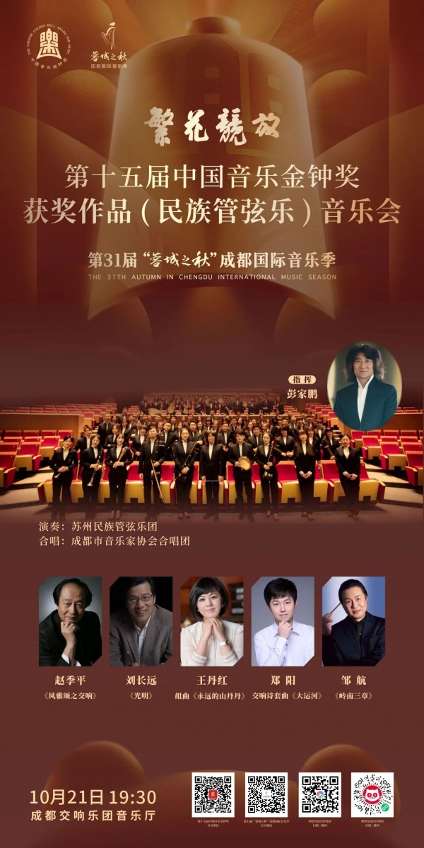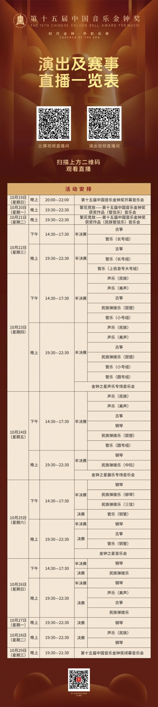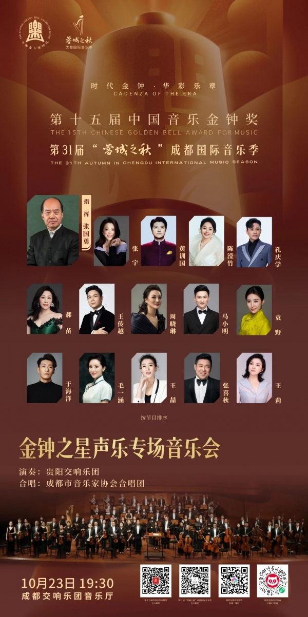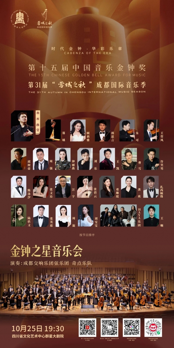 由中国文学艺术界联合会、中国音乐家协会主办,成都市人民政府、中共四川省委宣传部、四川省文化和旅游厅、四川省文学艺术界联合会承办,以 “时代金钟 · 华彩乐章” 为主题的第十五届中国音乐金钟奖正在成都如火如荼的举行。为满足更多观众的观赏需求,本届金钟奖将从半决赛开始线上直播。同时,本届金钟奖与第31届 “蓉城之秋” 成都国际音乐季深度联动,策划推出的多场高水平音乐会也将全程直播。敬请关注!