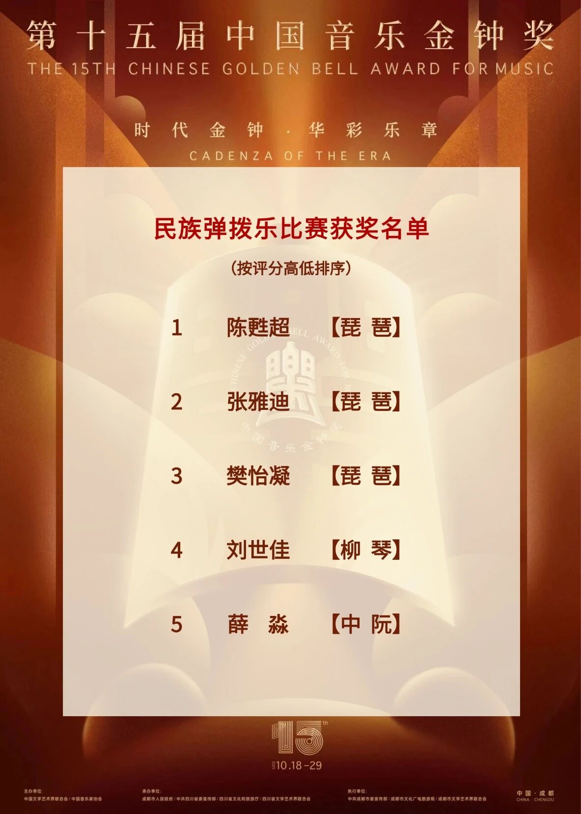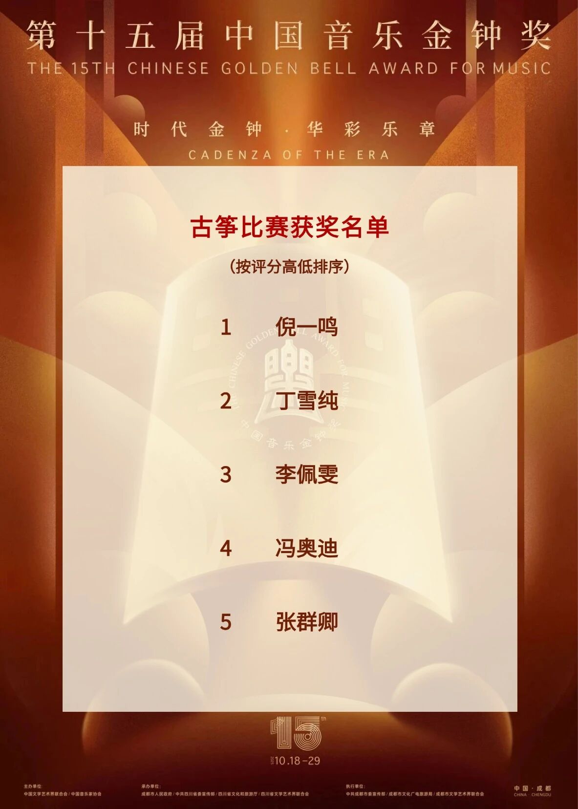 10月26日,第十五届中国音乐金钟奖古筝比赛、民族弹拨乐比赛决赛圆满结束,现将名单公布如下:
