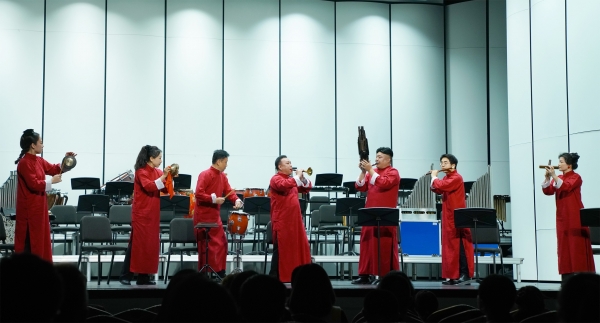 随后,安徽、江苏、浙江三地乐团陆续登台,聚焦非遗传承与地域根脉。安徽乐团徽之韵组合带来吹打乐《欢乐曲》,源自安徽民间乐曲的旋律经整理改编后,尽显“徽风皖韵” 的独特魅力;江苏省太仓市五洋丝竹乐团演绎江南丝竹《灯会》,节奏由简至繁,生动还原华灯璀璨、人声鼎沸的喜庆场景;浙江省浦江县清音民乐团演奏浦江乱弹《花头台》,四个乐段分别以不同乐器为主角,将浦江人率直奔放的个性与吉祥喜庆的氛围融为一体,尽显地方音乐特色。