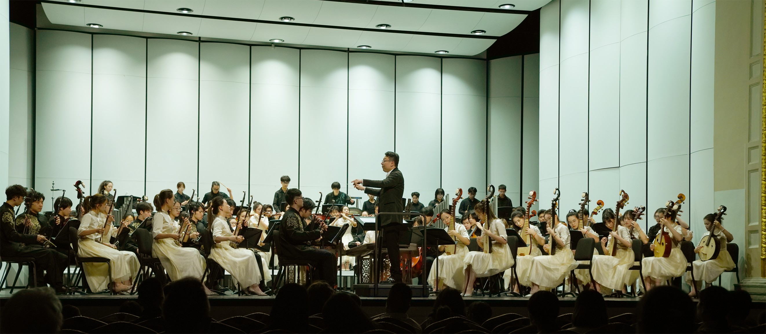 上半场,四支学生民族乐团率先登台。上海市杨浦区少年宫民乐团以《四季留园》开篇,用丝竹管弦勾勒苏州园林四季流转的细腻诗意;上海音乐学院实验学校民乐团带来《延河随想》,以陕北民间音乐为底色,抒发对革命历史的深情回望;闵行区青少年活动中心学生民乐团演绎《七彩之和》,诠释“和而不同”的文化理念,传递多元共生的人文精神;中国福利会少年宫小伙伴艺术团献上《逐梦》,以中西合璧的旋律激励新一代砥砺前行,奏响青春乐章。