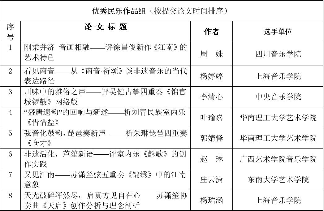 为深入学习实践习近平文化思想,推动中华优秀传统文化创造性转化、创新性发展,把中华优秀传统文化融入艺术教育、社会生活、立德树人的全过程,切实推进新时代中国民族音乐理论评论事业的建设,由中国民族管弦乐学会、山东大学艺术学院、《音乐周报》联合主办,中国民族管弦乐学会理论评论委员会与山东大学艺术学院联合承办了“第五届华乐杯民族器乐作品评论征文”活动。目前论文初审工作已完成,经7位音乐理论专家认真评议,现推选两个组别的16篇论文进入终评环节。