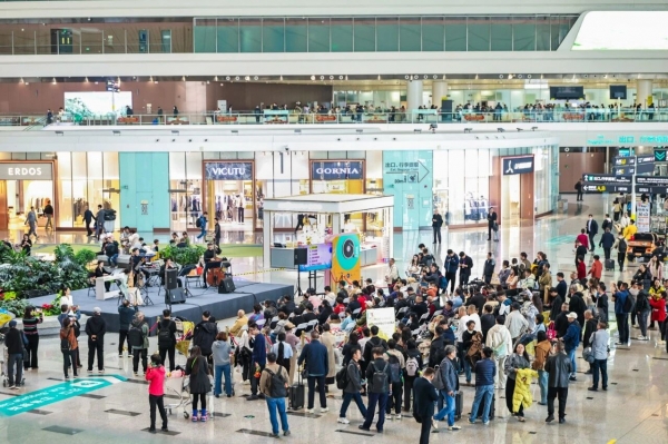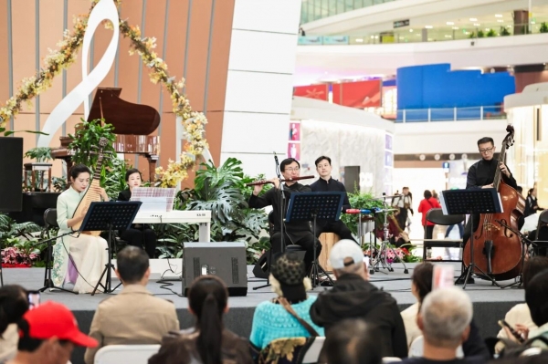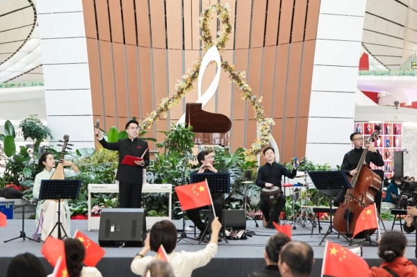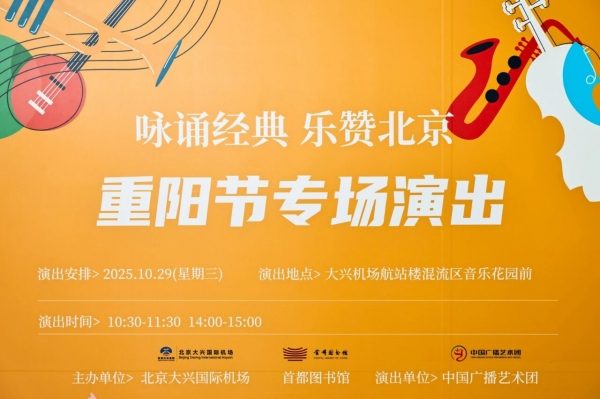 偶遇闰秋重九日,东篱独酌一陶然。10月29日,恰逢重阳佳节,北京大兴国际机场航站楼内丝竹悠扬、诗文琅琅,由北京大兴国际机场与首都图书馆联合举办,中国广播民族乐团“炫乐团”倾情演绎的“咏诵经典,乐赞北京”系列活动——重阳节专场音乐会在机场航站楼混流区音乐花园前连续上演上/下午两场,为国内外旅客精心策划打造了一场充满人文温度和艺术底蕴的民乐雅集。
