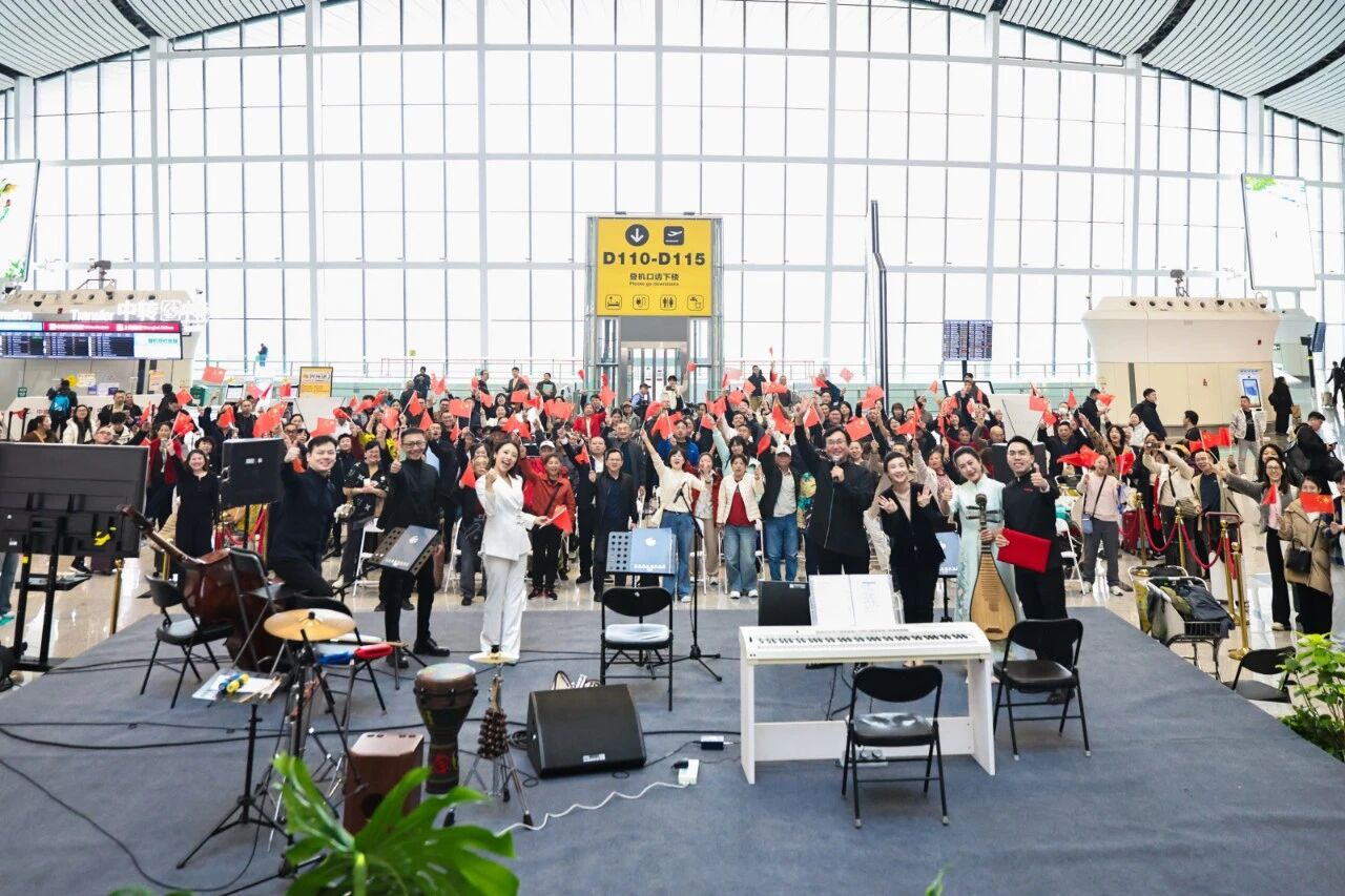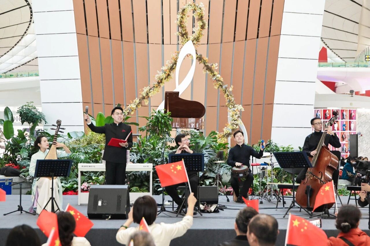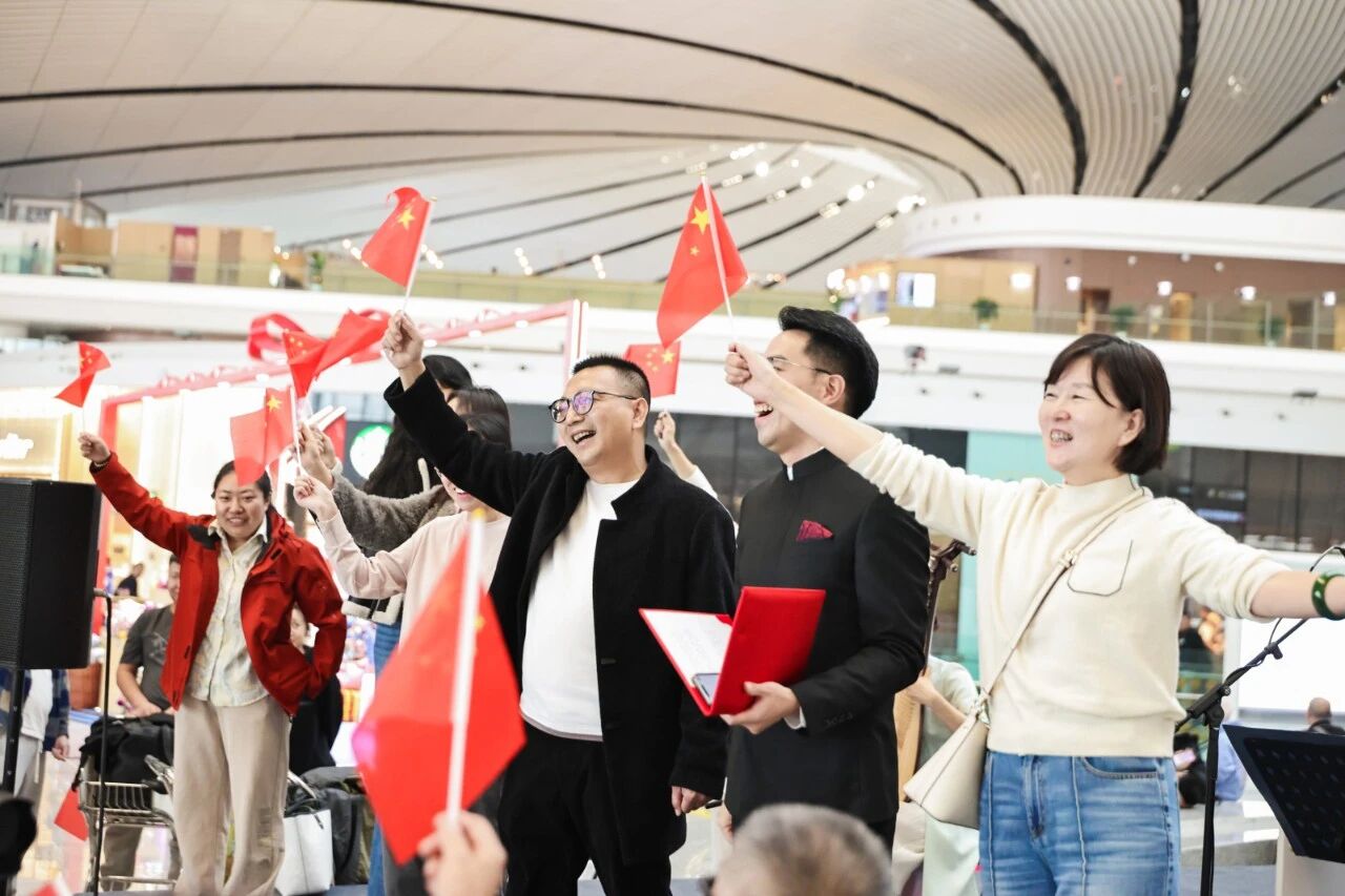 当《我和我的祖国》熟悉的旋律在大兴机场航站楼响起,现场每位观众手中的小型五星红旗,瞬间化作一片流动的红色海洋。大家循着节拍轻轻舞动旗帜,用合唱将对祖国的热爱与深情融入每一个音符,让旅途的疲惫被温暖的家国情怀所包裹。这一面面小红旗,是中华儿女与祖国母亲的情感联结;这一声声合唱,是传统节日里最动人的时代回响。至此,这场重阳佳节民乐盛宴圆满落下帷幕,但这份对经典的传承、对祖国的炽热深情,将随着往来航班传递至五湖四海更远的地方,也让 “咏诵经典,乐赞北京” 的文化温度,长久留在每一位旅客的心中,铭记这一份感动与暖意。