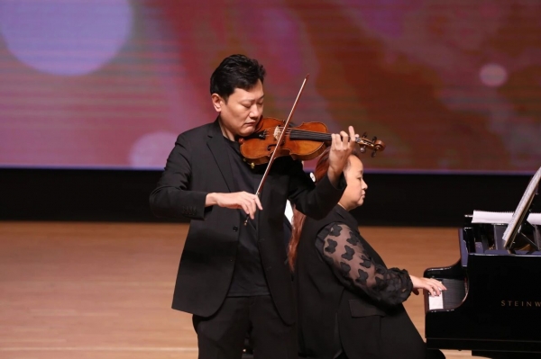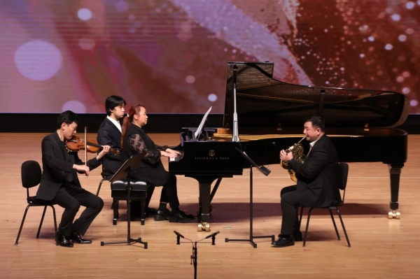 所谓顶尖,不仅代表着一门艺术的典范,更象征着能够启思育才的匠心。此次登台的高层次人才代表,不仅自身成就斐然,更有多位“金校徽奖”获得者。他们秉持育人初心,所指导的学生已在文华奖、金钟奖,柴科夫斯基国际音乐比赛、“布拉格之春”国际音乐比赛等国内外顶级赛事中斩获佳绩,让技艺在教育的耕耘中至臻化境。陈曦(管弦系教授)与原丁(管弦系教授)联袂的《美丽的罗斯马琳》《爱的忧伤》《爱的欢乐》三联奏,以及二人与满燚(管弦系教授)共奏的《钢琴三重奏》(Op.105,第三乐章),技巧精妙而不失稳健,三件乐器的对话自然流畅而不喧宾夺主。从柴科夫斯基国际音乐比赛史上最年轻的首奖获得者、到敲响金钟的艺术指导与“布拉格之春”的引路人,得益于教学相长中的深厚经验,三位演奏家熟稔于技术精度与艺术深度之间的平衡。相比于激情的碰撞,其演绎更令人感到纯熟与从容。