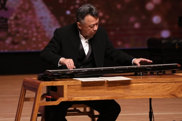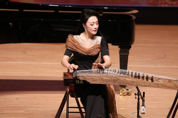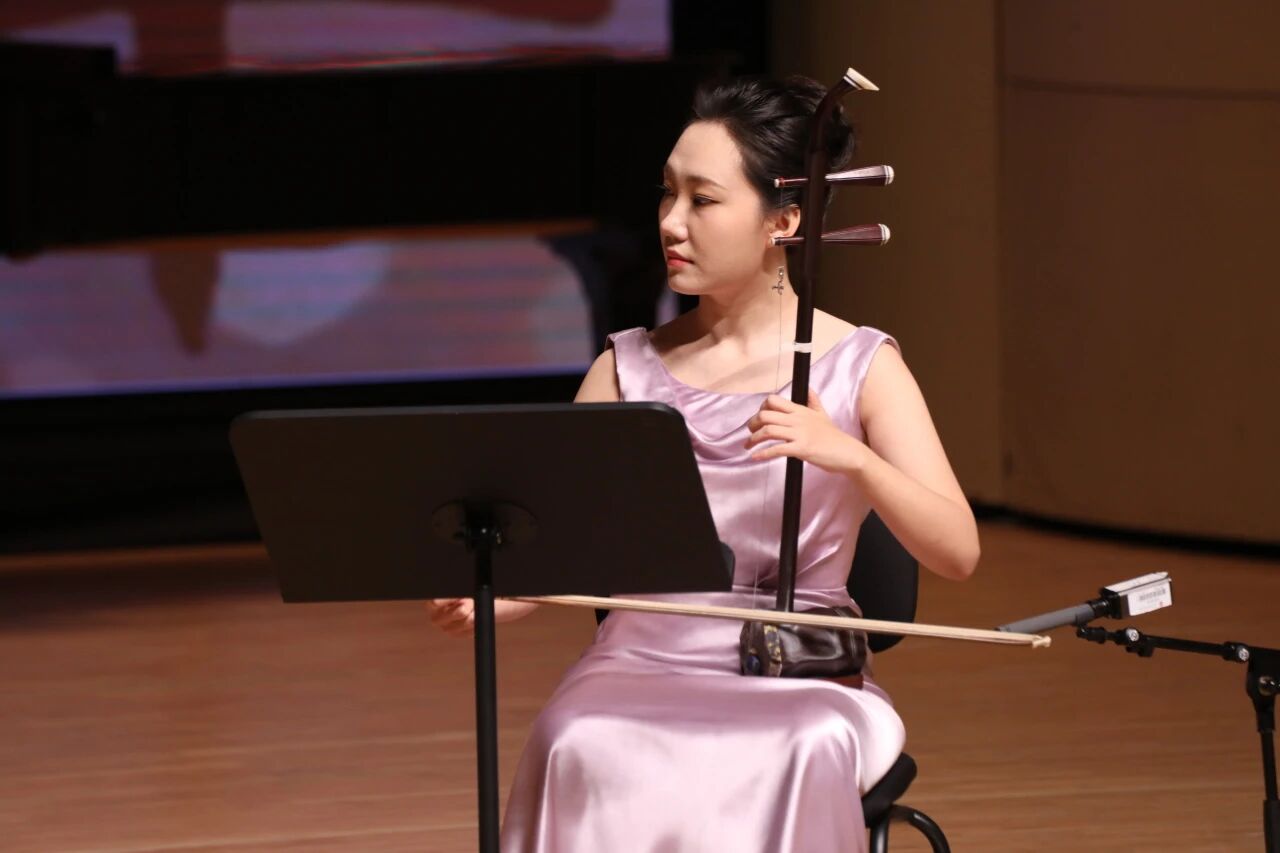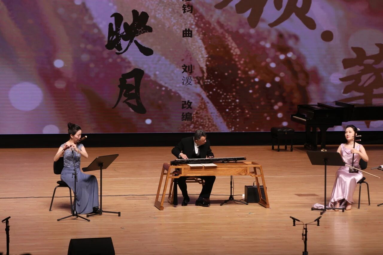 无论是《我爱这土地》中对故土的深情眷恋,抑或《我不朽的里拉琴》那细腻的抒情,女高音石琳(声乐歌剧系副教授)依靠其扎实的气息控制与精准的共鸣处理,情感饱满而不失含蓄。勾抹托摇,苏畅(民乐系副教授)在指尖的动静虚实之间摹写出《枫桥夜泊》的落月清辉、渔火朦胧;和静恬逸,陈雷激(民乐系教授)以吟猱中的清浊迟速为新编作品《二泉映月》注入风骚雅致,不失《太古遗音》之风。倘若说古琴在这首乐曲中所呈现的意象为静凝青寥、阴晴不定的月,那么高白的二胡与冯天石的箫,则在丝竹合和中成为了细流涓涓的泉,悠远婉转,使得全曲并不似华彦钧原版那般凄凉,而更有自然意象的清幽之感。