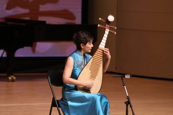 琵琶声出,一如铁马踏震冰河,又如寒鸦悲恸呜咽,一场九里山大战,一部英雄的哀歌。民乐系主任章红艳教授所演绎《十面埋伏》,在长轮缓急中摄出腾腾杀气,于刹弦滚拂间拨出剑影刀光,将原曲中饱满的戏剧性张力挥洒尽致,同时也将“四面楚歌”排阵于舞台之中——台上一人与散布于台下的众人使声音得以在环境中流动,构筑起鲜活的动态声景。这不仅展现出一位成熟演奏家老练纯青的技术,更彰显出其探索发掘古曲经典表现潜力的深邃艺境。