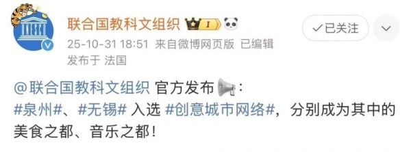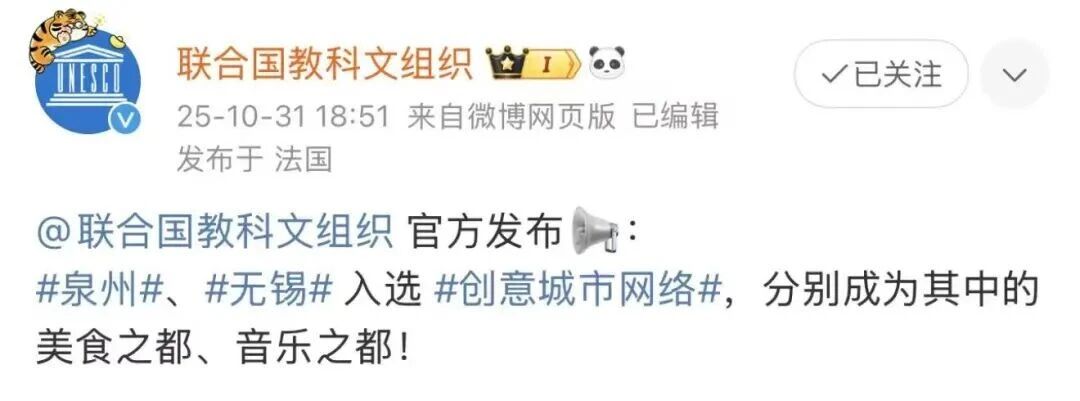 近日,联合国教科文组织(UNESCO)宣布中国无锡凭借其深厚的音乐文化底蕴与创新发展实践,成功入选“创意城市网络”成为中国首个“世界音乐之都”。