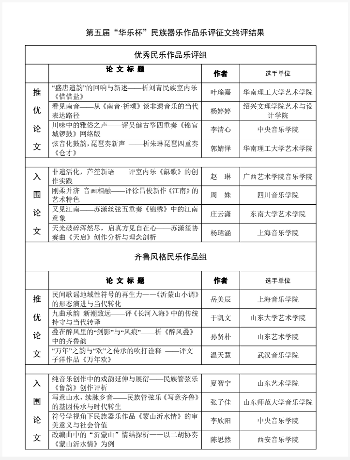 “华乐杯”终评活动秉承严谨求实的学术精神与开放多元的研究视野,鼓励青年学者立足民族音乐评论实践,深入探讨中国民族器乐作品在创作理念、文化传承与当代表达中的多重价值,既是学术成果的集中展示,也是推动民族音乐评论事业高质量发展的重要契机。活动为期两天,来自各地的16位青年学者依次进行了论文宣讲,内容涵盖“非遗音乐的当代表达”“民族管弦乐的艺术创新”“传统乐曲的现代转译”等多个主题,展现了当代青年评论者对民族音乐审美、文化意象及评论话语的深入思考,第五届“华乐杯”专设了“齐鲁风格”民乐作品组,针对利用山东传统音乐因素的当代音乐创作进行评论。与会专家在聆听论文汇报后,对作品的评论视角及理论深度进行了细致点评,并就民族音乐评论的学科建设、方法创新与理论体系拓展等问题展开深入交流与探讨。本次会议为青年学者提供了高水平的学术交流平台,为进一步推动新时代民族音乐理论评论研究事业的发展与人才培养发挥了积极作用。