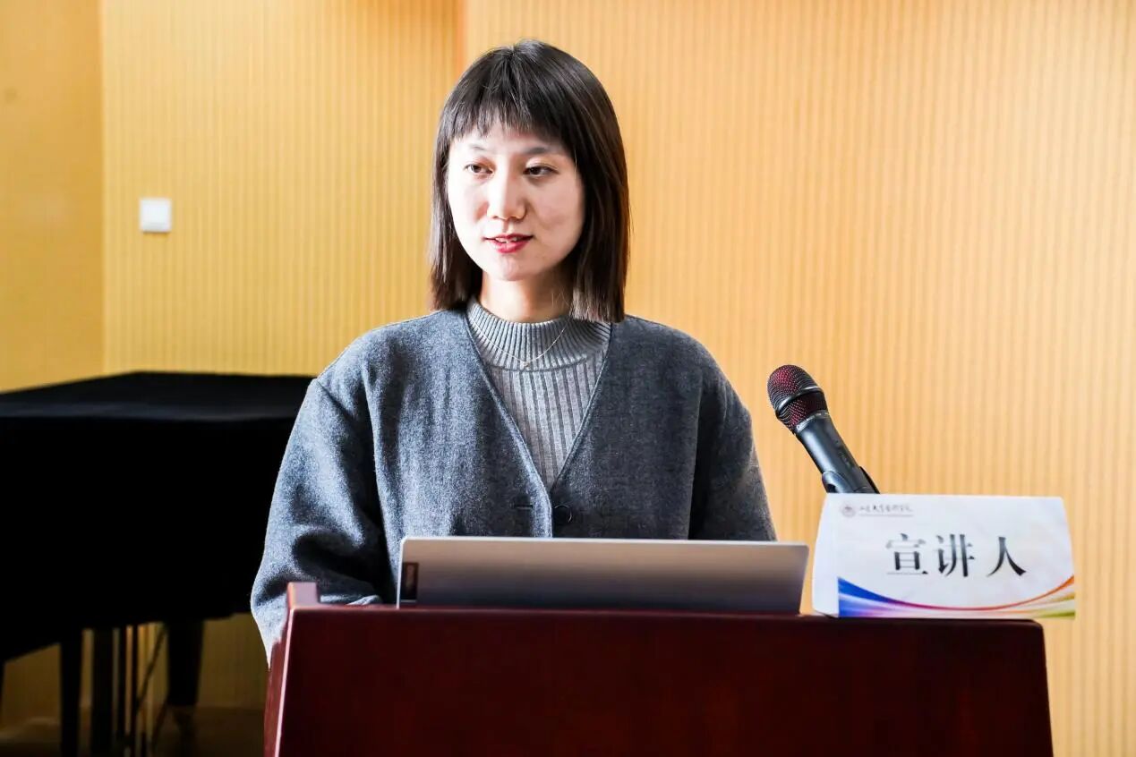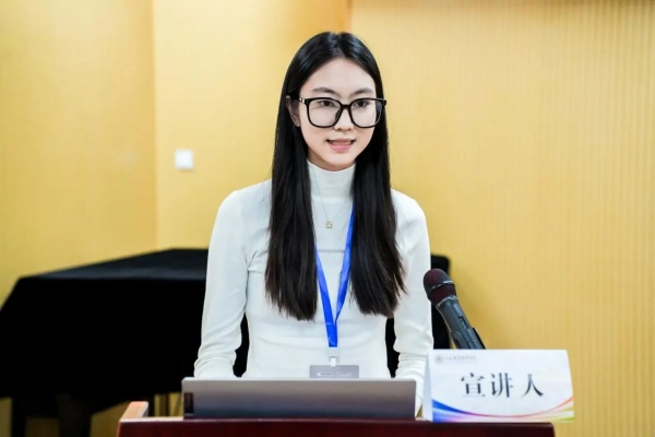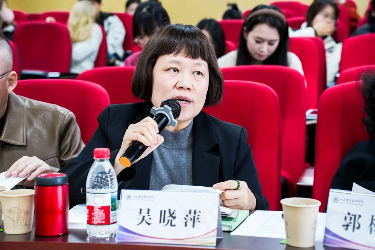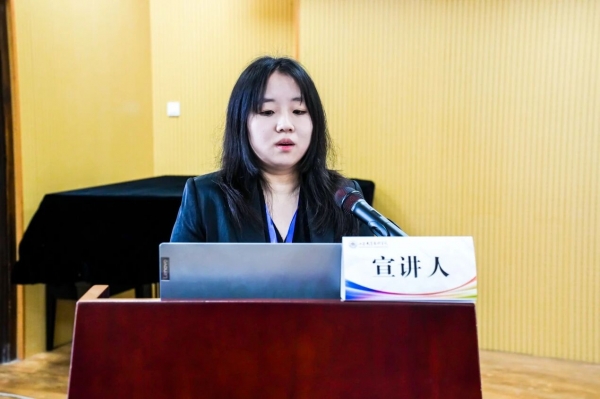 第六位宣讲人是来自山东艺术学院的孙贤朴,论文题目为《叠在醉风里的“剑影”与“风痕”——析〈醉风叠〉中的齐鲁韵》。文章通过对《醉风叠》的深入分析,指出其独特的音乐风格既延续了齐鲁文人“文以载道”的精神传统,又体现出用音乐传达历史信息的创作理念,实现了对齐鲁文化的当代诠释与理解。文章主要分为三个部分,第一部分介绍了作曲家的创作图景与灵感来源。第二部分探讨了音乐本体中的和声、曲式与音乐特点,探究其如何以音乐本体为桥梁,实现文学意象向听觉艺术的转化。第三部分研究了作品的创新传播与齐鲁文化的传承,指出这部作品既在调性融合与创作理念中注入文化象征的深意,又以新的传播路径,让齐鲁文脉在不同的领域焕发新声。作曲家并非简单复刻辛李诗词的文字符号,而是以音乐传达历史的创作理念,将齐鲁文化“刚健有为”“兼容并蓄”的精神内核,转化为可听、可感、可传的音乐叙事。在专家点评环节,吴晓萍教授指出文章音乐分析非常细致,文风具有文学色彩。对文章的建议是:将技术分析和文化阐释相结合;在技术分析中需要加入个人感受和意象解读;曲式分析中的“回旋性”定义需要更加精确;文章结构需要进行调整,避免过于分散;避免乐器与风格的对应过于标签化;文字表达需要更加精准。蒲方教授指出文章对于“叠”的反思很好,体现了批判性。文章的不足在于:题目中的主副标题缺少逻辑性;副标题的“齐鲁韵”在文章中缺乏相对应的音乐分析;对于该作品的定位需要斟酌,建议强调一种新的“齐鲁韵”;还有一些用词和历史考证问题。