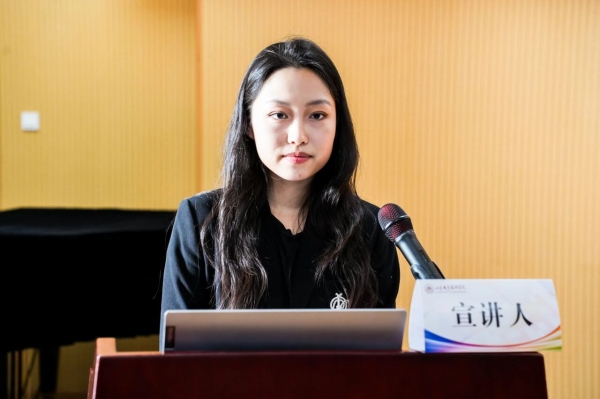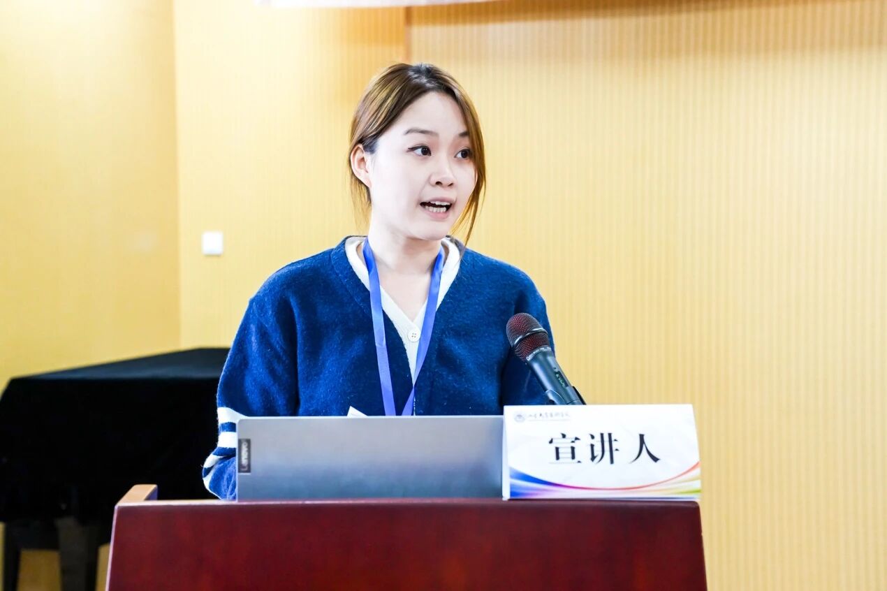第四位宣讲人是来自上海音乐学院的杨珺涵,论文题目是《天光破碎浑然尽,启真方见自在心——苏笙协奏曲<天启>创作分析与理念剖析》。文章指出《天启》以藏族文化为底色,通过“天启”意象构建了当代民族音乐的哲学表达。第一部分探析了结构与调式逻辑:作品以两次“天启”事件为核心,构建了“起承转合”式结构,调式组织呈现由模糊到清晰的民族色彩递进——从无明显音高序列、全音阶逐步向中国民族调式回归,形成了一种向心性分布,体现了传统音乐思维的当代重构。第二部分探究了音响建构:作品融合笙的传统技法与技法移植,结合打击乐组与其他乐器组,形成三元并置形式的配器。其中,打击乐象征“天”之肃穆,拉弦、弹拨、吹管乐器以音色变奏呈现“人”之率性,由此构建立体音响空间。第三部分阐释了文化哲思:作品的两次“天启”映射了藏族哲学中的“天人观”,实现了从外在景观向内在超越的转化。最后,作者指出该作品彰显了中国当代音乐创作在“可行性”与“必行性”之间的平衡,为少数民族音乐题材的当代表达提供了思辨范式。在专家评议环节,吴晓萍教授指出语言表述问题,认为行文风格较为抽象,引用文献需要进行解读,学术性、专业化的术语需要加以解释,还应注意行文规范。蒲方教授点评道:文章结语应该多一些价值提升与总结,作者自创的“民族调式色彩明晰度”难以实现普适性。