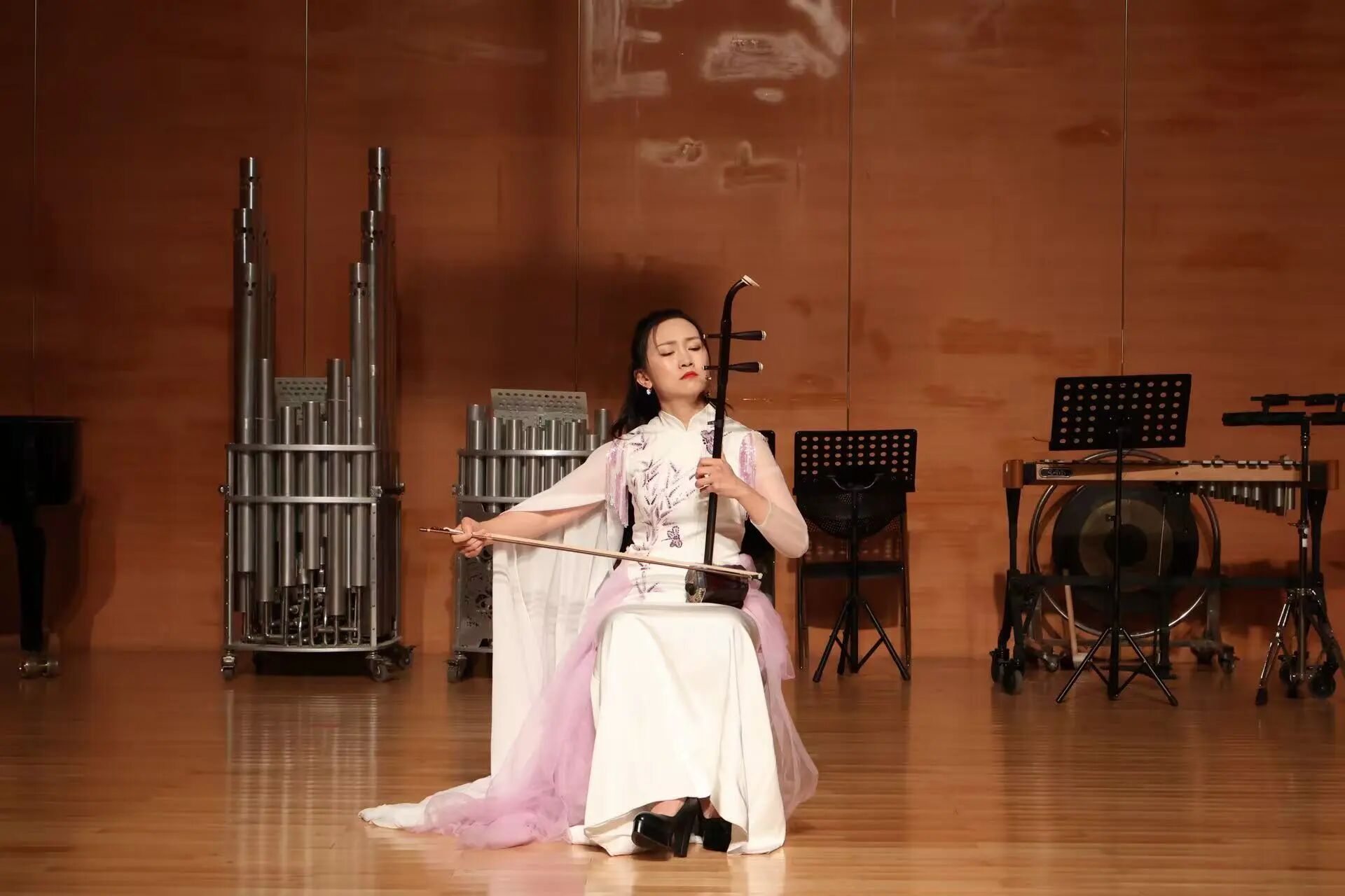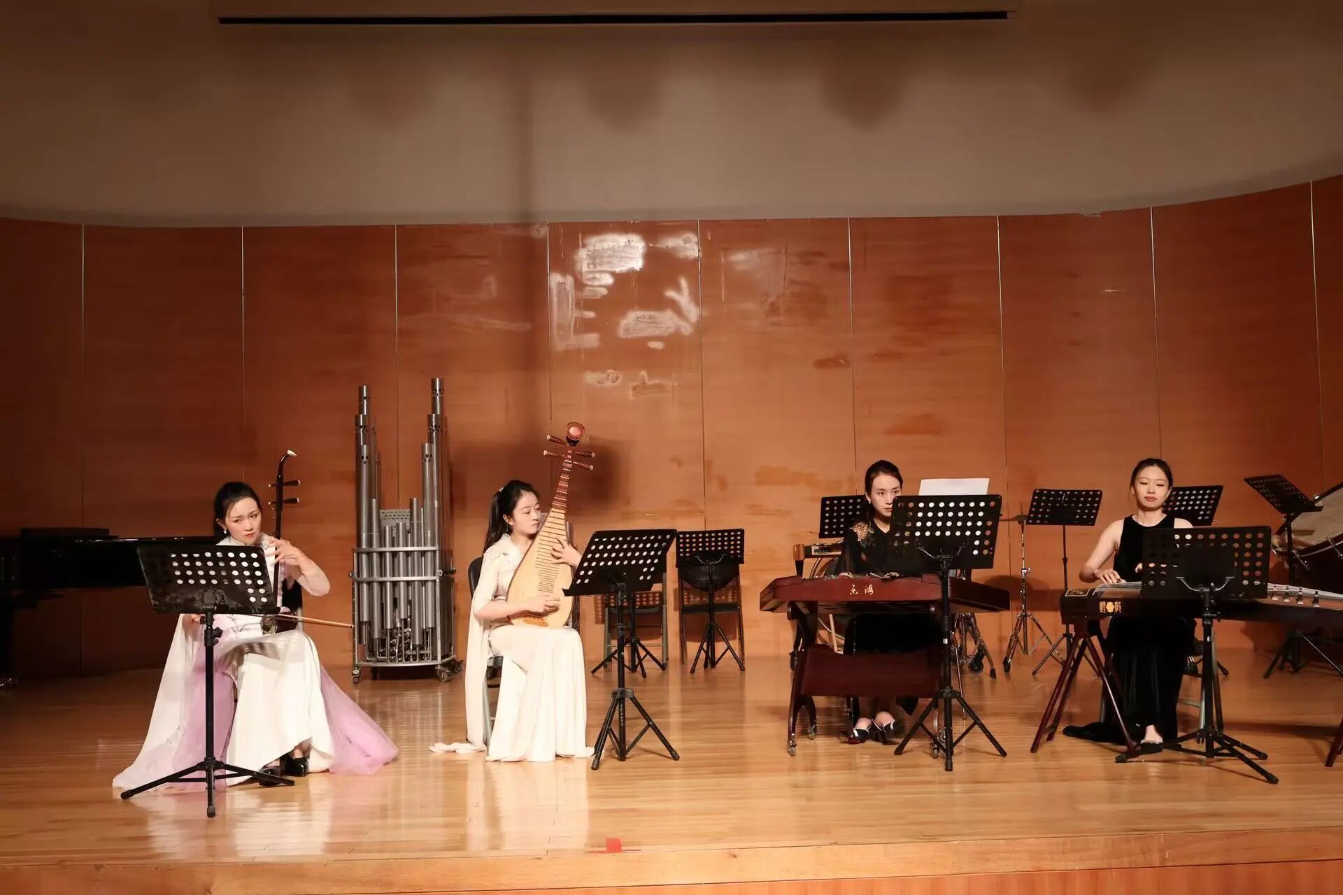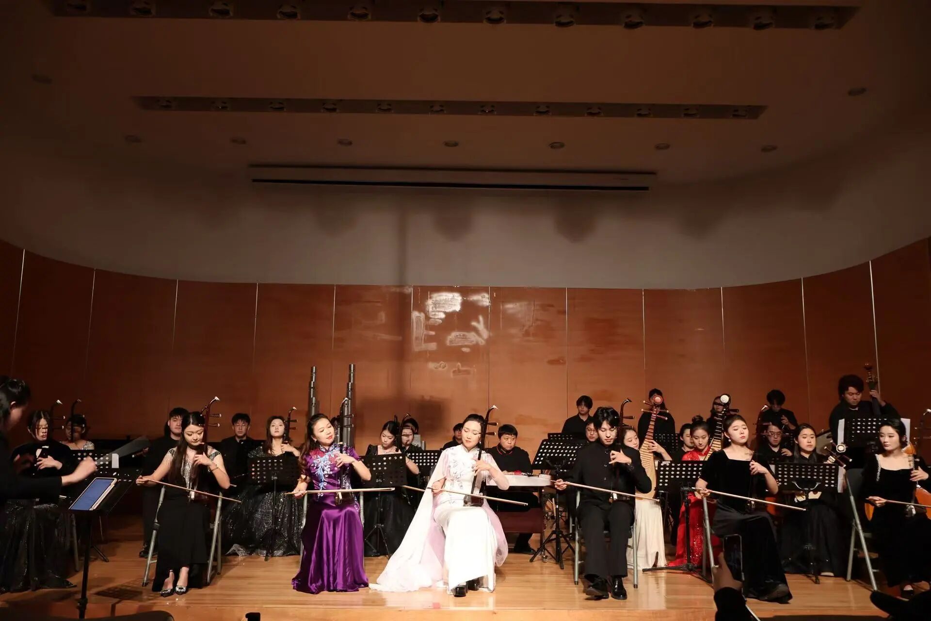 芳华绽放,乐韵流长。民族器乐系秋季音乐会在经久不息的掌声中圆满落幕,这既是对金秋时节的艺术献礼,更是对教学相长的生动见证。四场音乐会如同四幅音画长卷,既有古曲的深沉隽永,亦见新声的探索突破。青年学子们以指尖流淌的旋律诉说文化传承的故事,用琴瑟和鸣的默契展现民族音乐的当代活力。舞台上每一个音符的精准演绎,都是无数个清晨与深夜勤学苦练的结晶;每一曲终了时的灿烂笑容,都闪耀着对民族音乐最赤诚的热爱。这场音乐盛宴不仅展现了教学体系日趋成熟的丰硕成果,更让我们看到传统艺术在新时代土壤中焕发的蓬勃生机。赓续薪火,砥砺深耕,民族器乐系师生必将以此次音乐会为新的起点,在守正创新中继续追寻民族音乐的永恒魅力,让穿越千年的丝竹之声,永远在时代的脉搏中铮铮作响。