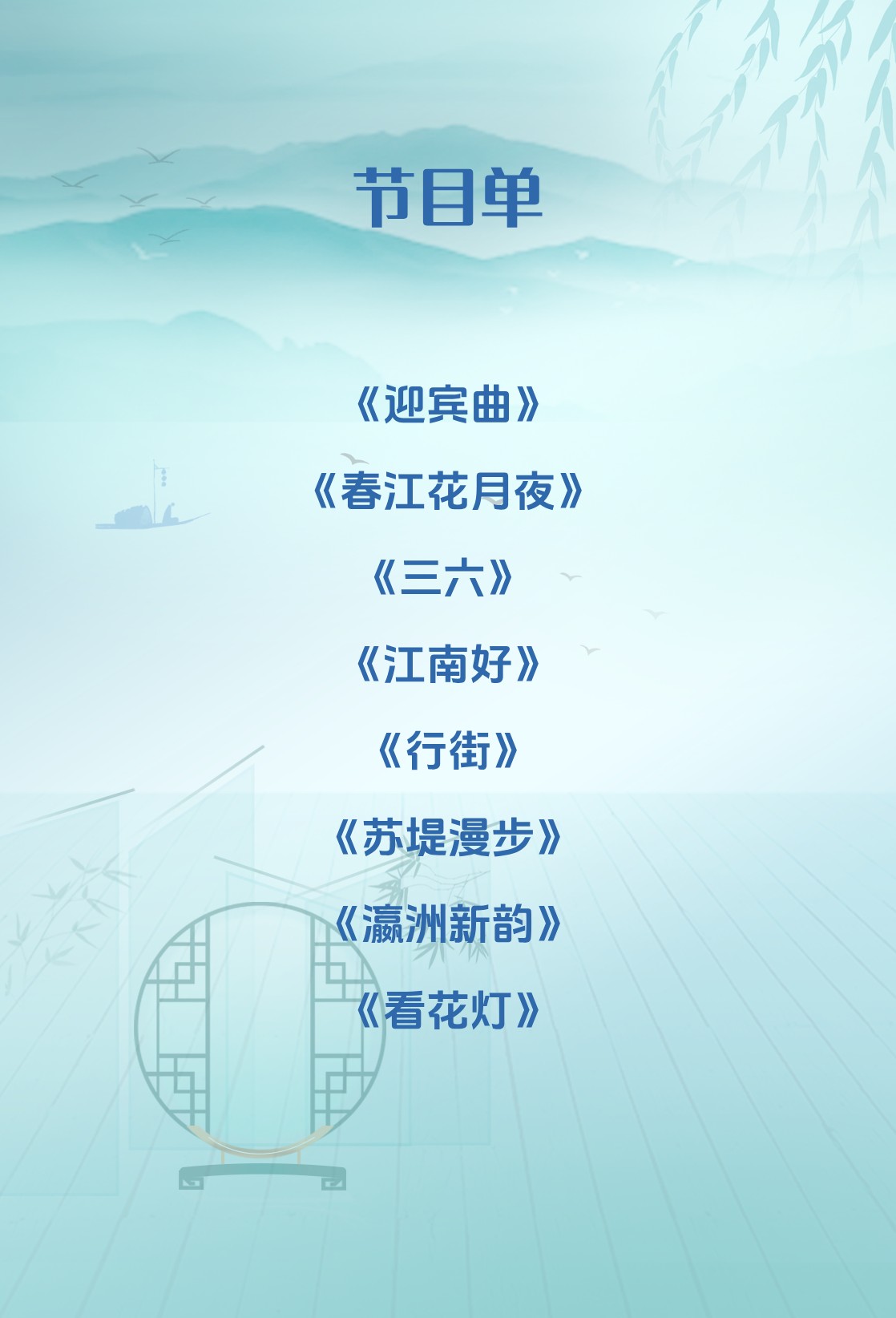 《迎宾曲》起,笙箫齐鸣如春风拂面,拉开雅集序幕;《春江花月夜》的婉转旋律,恰似“月在人边花在水”的秦淮夜境,琵琶轻弹间漾开千年月色;《三六》《行街》的灵动节奏,勾勒出江南市井的鲜活生机,宛如青石板路上的步履轻快;《江南好》《苏堤漫步》则以清润曲调,铺展“千里莺啼绿映红”的江南画卷,二胡与笛子的和鸣里,满是水乡的柔婉与清朗。更有《瀛洲新韵》以创新笔触续写非遗新篇,让古老丝竹焕发时代锋芒;《看花灯》的欢快旋律,呼应着“秦淮风月真无价,灯火笙箫常彻夜”的盛景,丝弦竹管间尽是祥和喜乐。