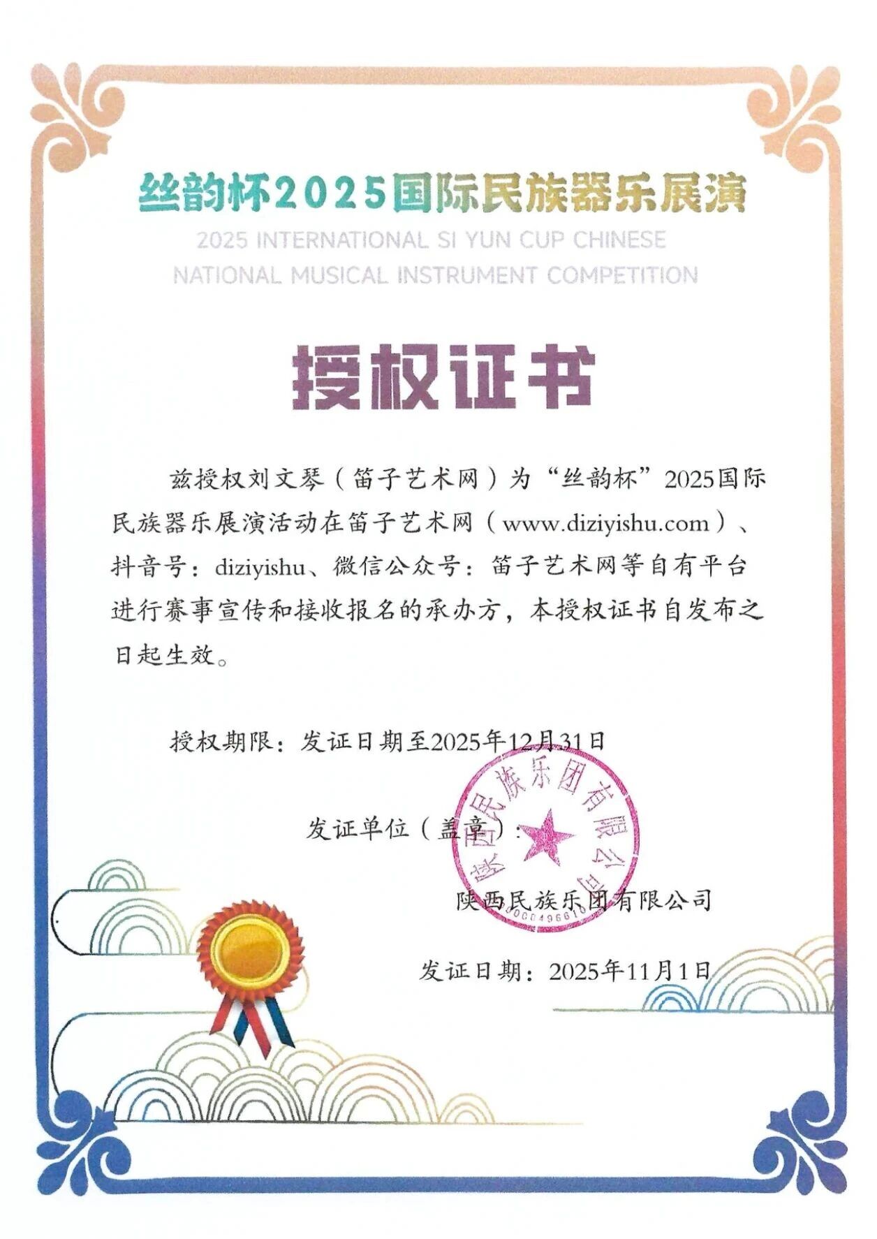 为深入贯彻落实习近平总书记关于文化传承发展的重要论述,弘扬中华优秀传统文化,增强文化自信。由陕西旅游集团主办;陕西民族乐团有限公司、陕西省广播电视民族乐团、陕西省艺术考级服务中心共同承办“丝韵杯”国际民族器乐展演活动,本次民族器乐展演活动旨在搭建高水平、专业化、立体化的艺术交流平台,推动民族音乐艺术的创新性发展与创造性转化。通过展演活动,挖掘和培养优秀民乐人才,展现民族音乐的独特魅力,同时,以民乐为纽带,增进社会各界对中华文化的认同感与自豪感,为传承中华文脉、建设社会主义文化强国贡献力量。